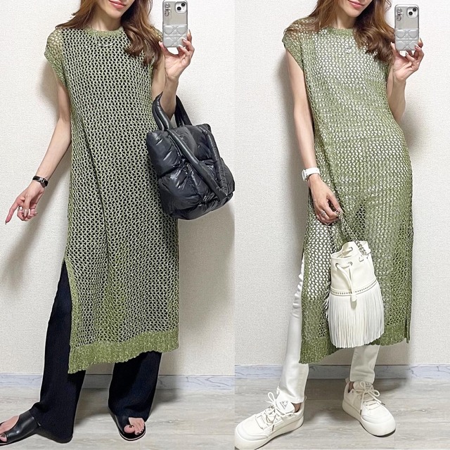 *必ずショップ情報/aboutをご覧の上ご購入下さいませ* カーキ 着丈105 身幅52 裾幅58 アクリル60% ポリエステル32% ナイロン8% モデル164㎝ ▪️ざっくりとした編地で透け感が特徴のワンピース ▪️ロング丈で体型カバーにもピッタリ◎ ▪️サイドスリット入りで足さばきもストレスフリー ▪️コーデに抜け感をプラスした涼しげなレイヤードアイテムです ▪️着用パンツ▪️ 楊柳プリーツパンツ ▪️着用インナー▪️ ボートネックオーバーワッフルTP/ブラック テレコリブshort length TP/ホワイト