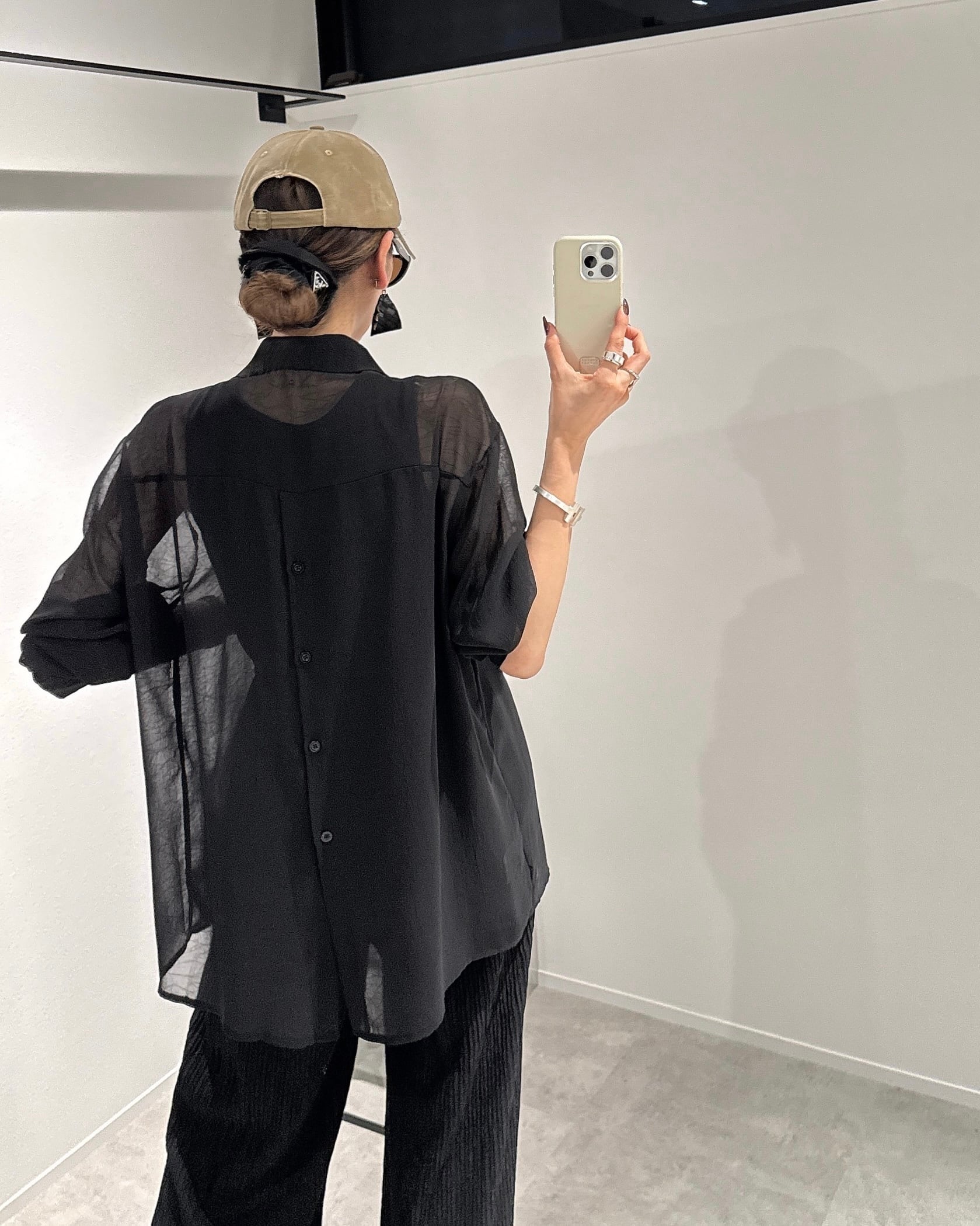シワ模様の入ったバックボタンデザインのシアーブラウスです