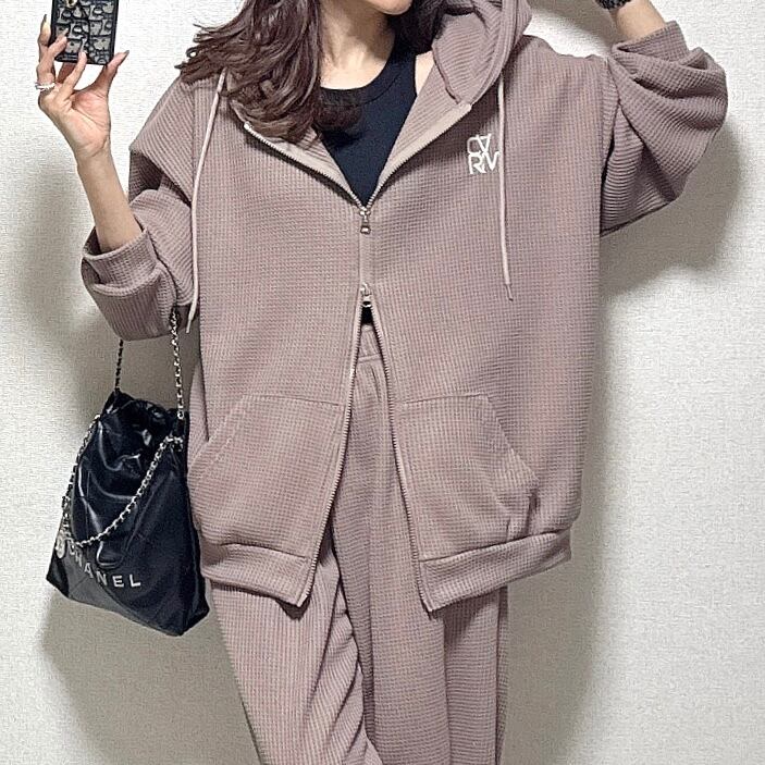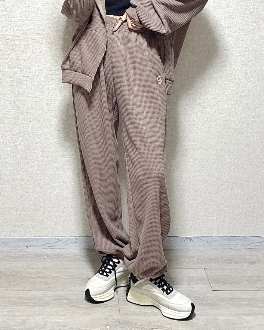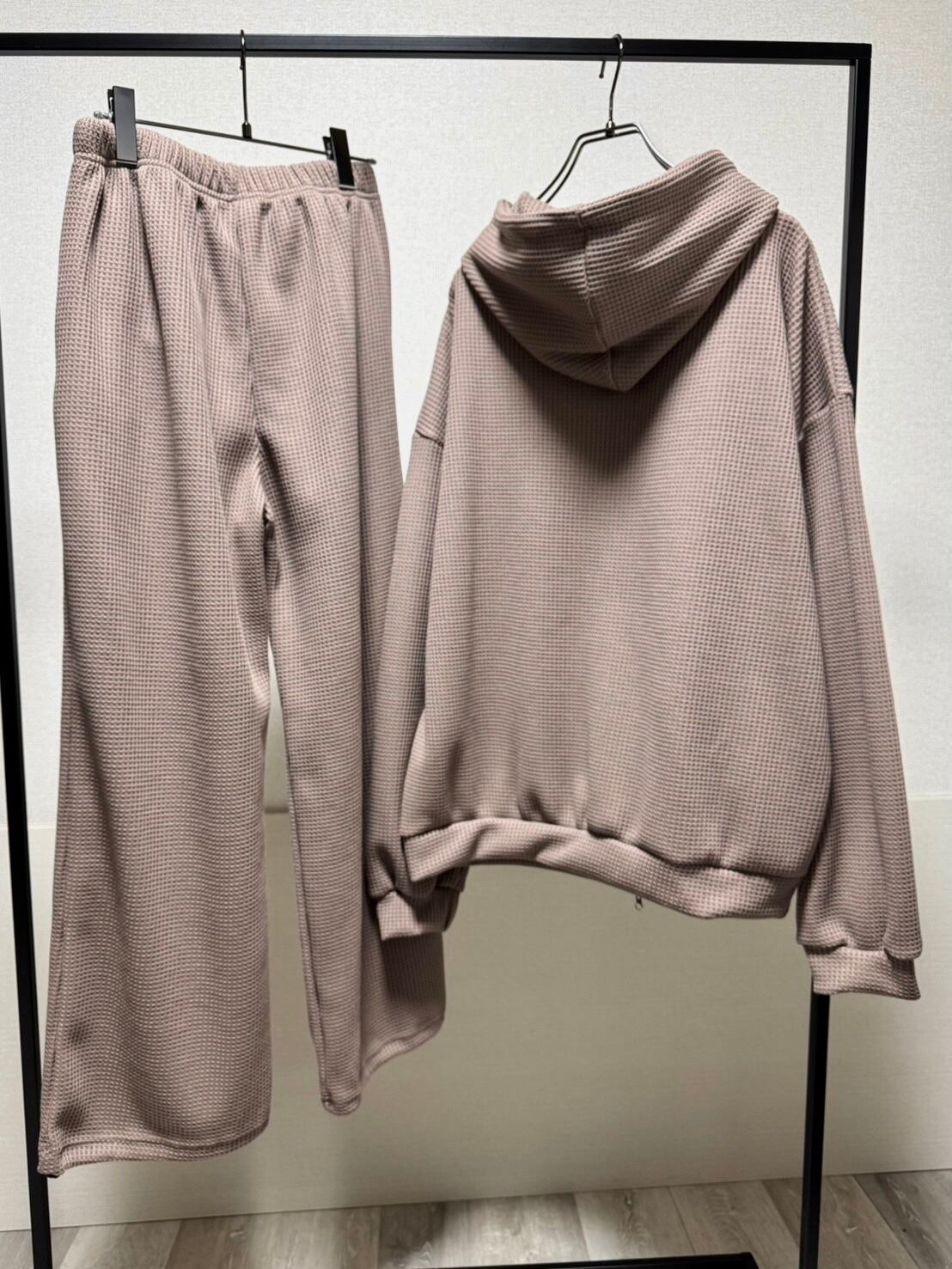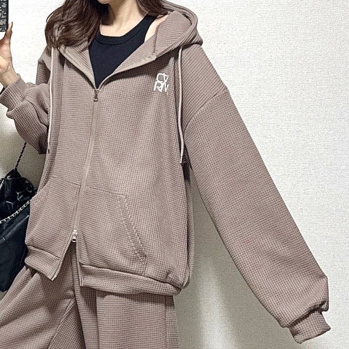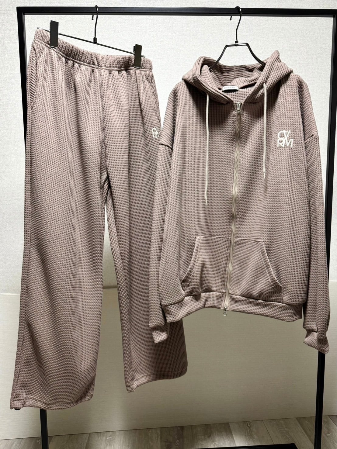 ロゴ刺繍ワッフルダブルzipパーカー×裾2wayワッフルPT/セットアップ/モカ