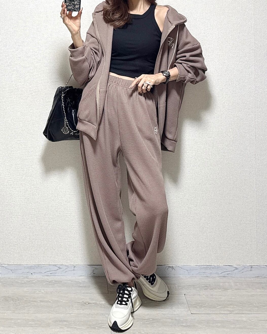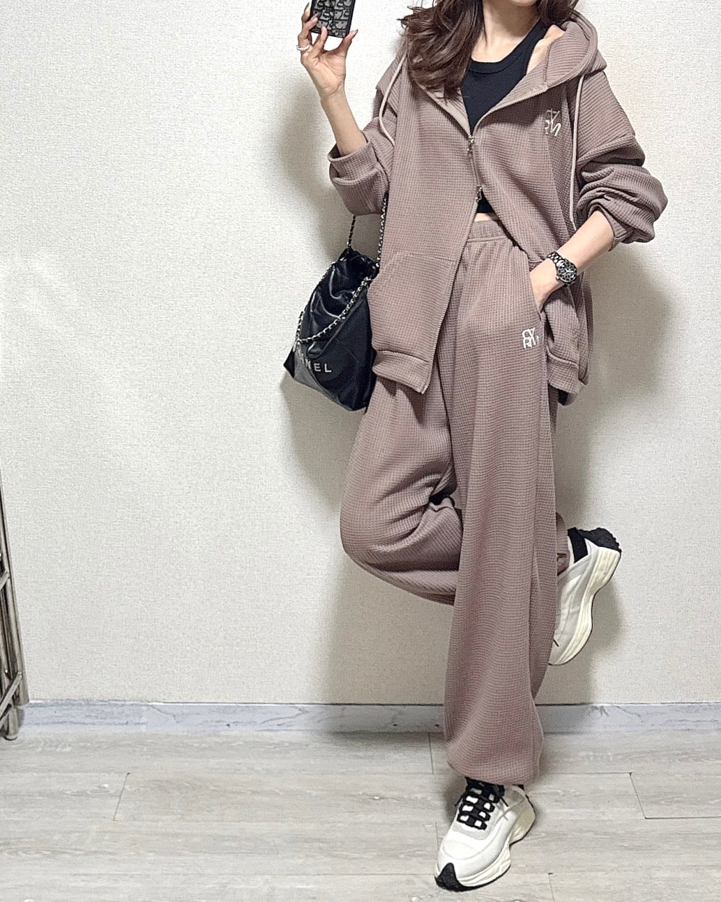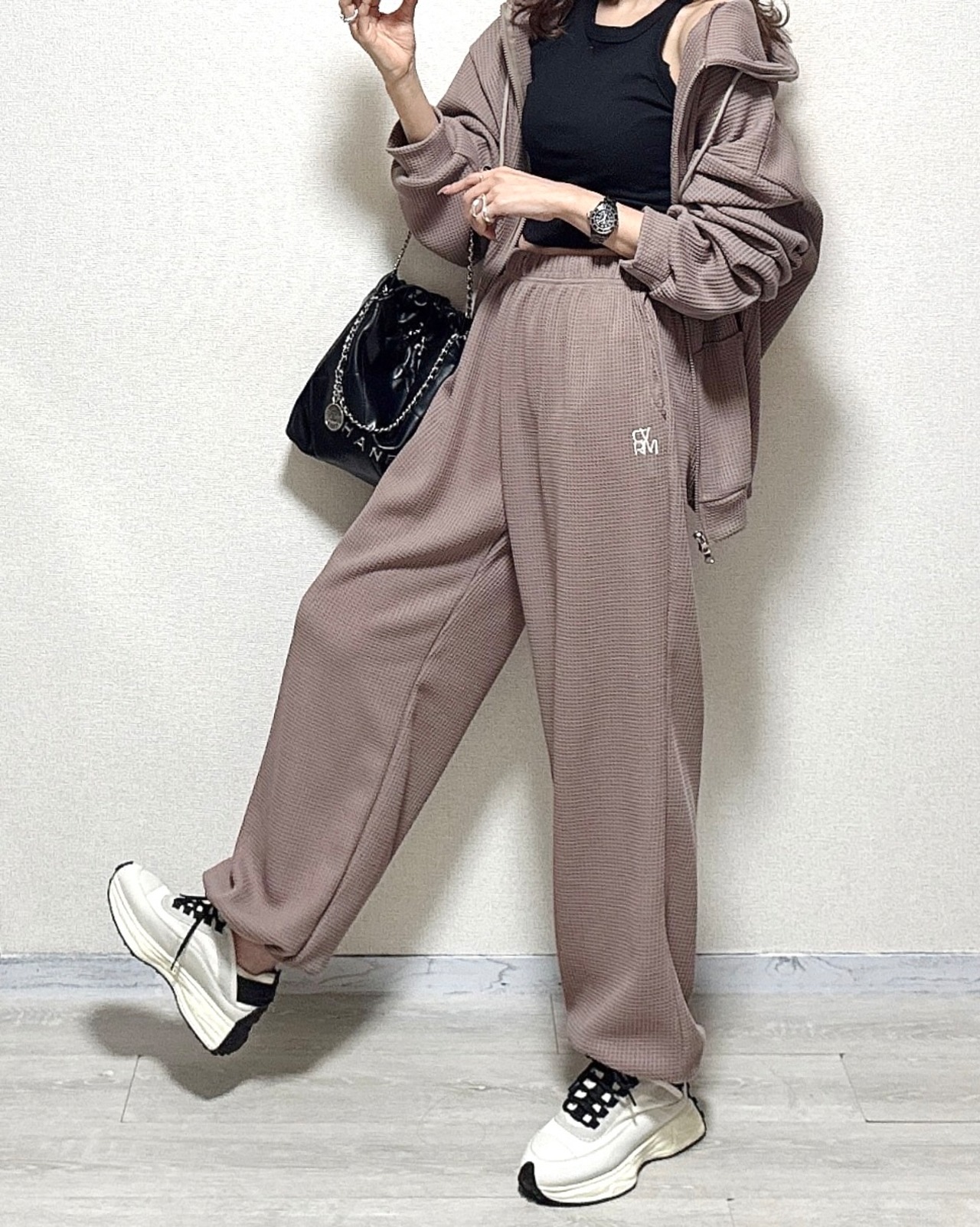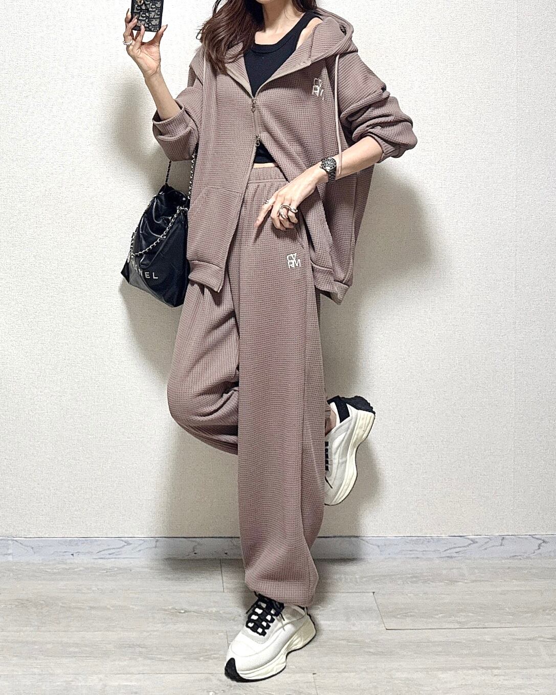 ロゴ刺繍ワッフルダブルzipパーカー×裾2wayワッフルPT/セットアップ/モカ