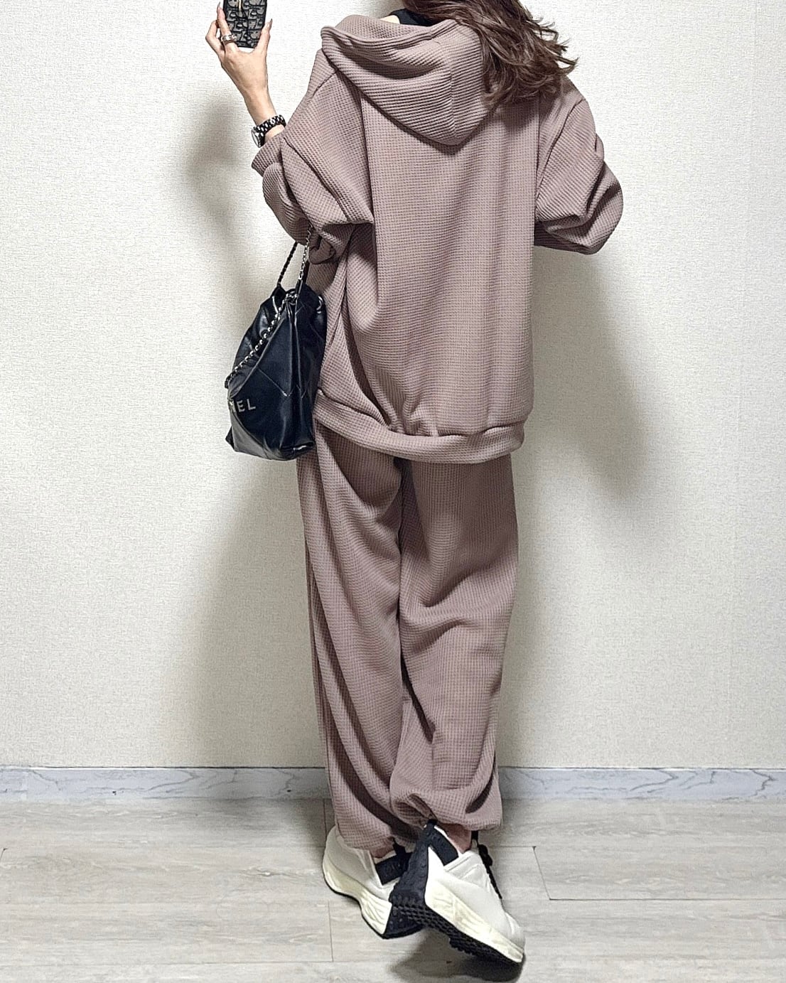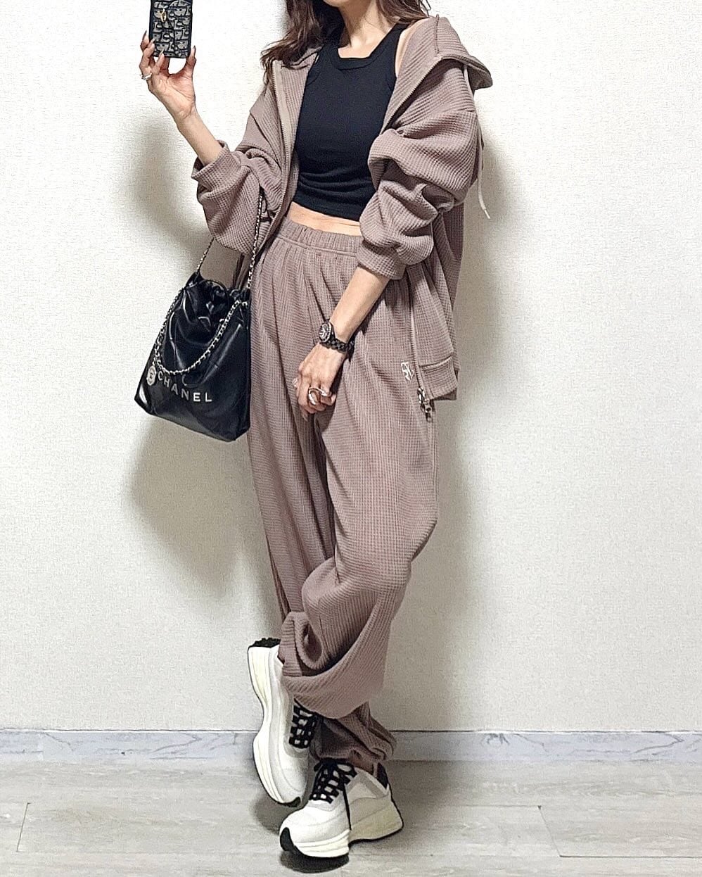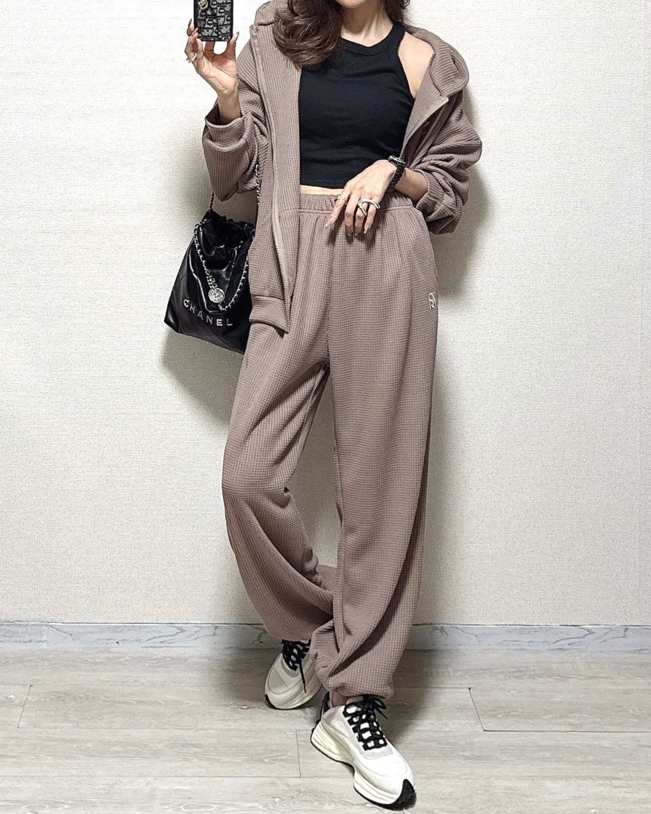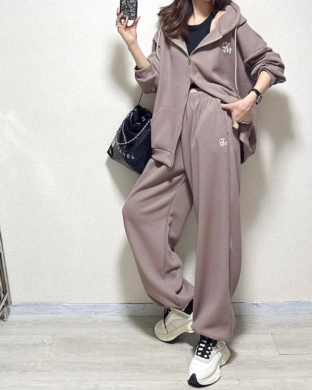ロゴ刺繍ワッフルダブルzipパーカー×裾2wayワッフルPT/セットアップ/モカ