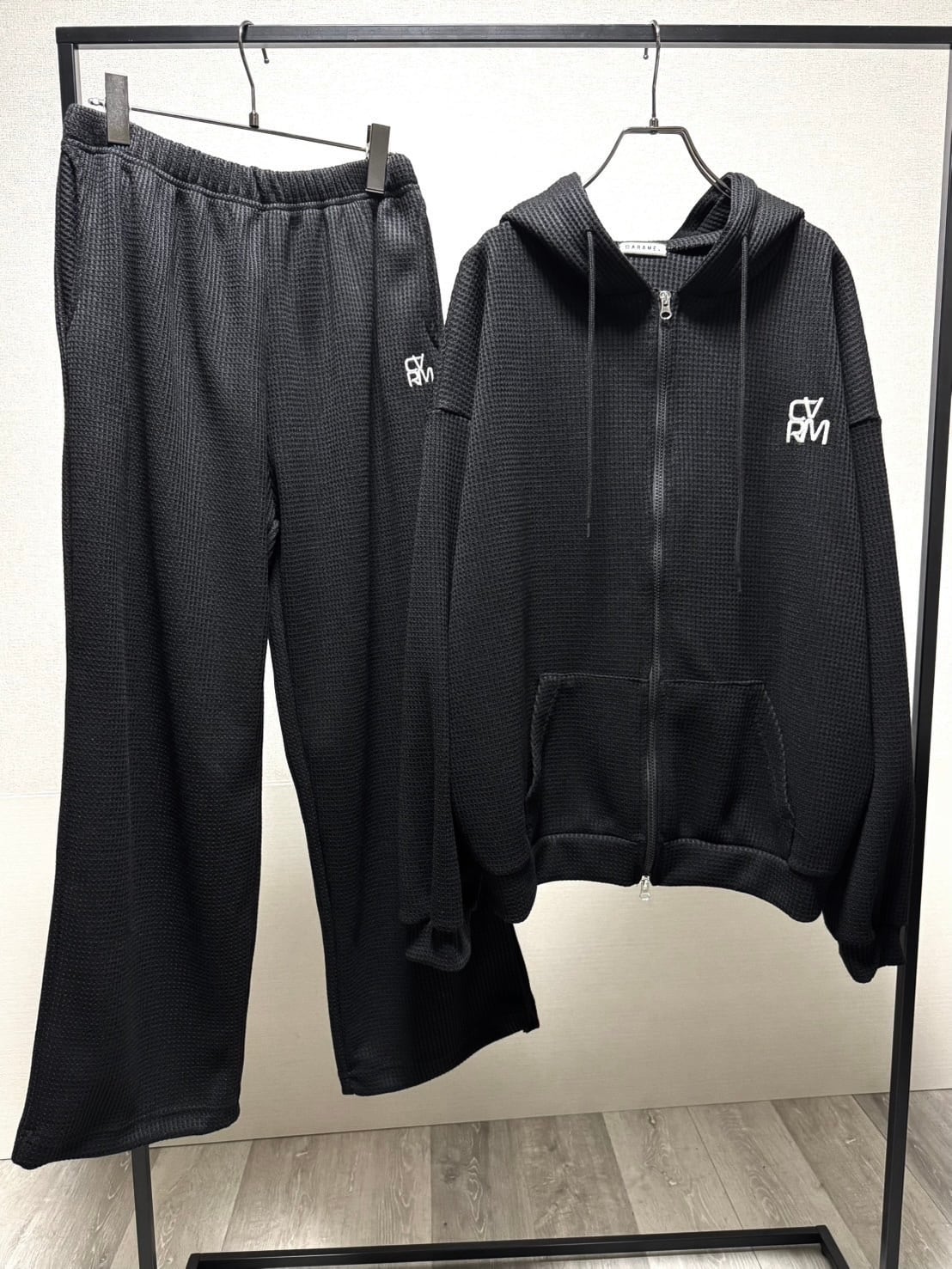 ロゴ刺繍ワッフルダブルzipパーカー×裾2wayワッフルPT/セットアップ/ブラック