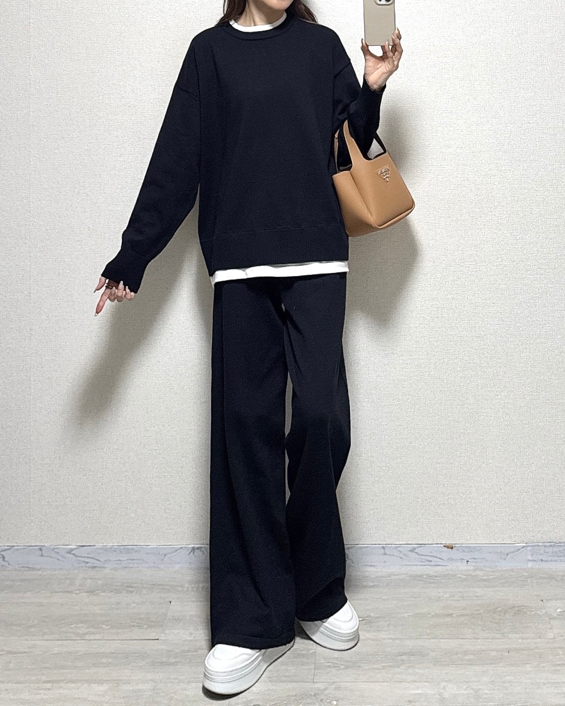 レイヤード風クルーネックknit×ワイドknit PT/ライトknitセットアップ