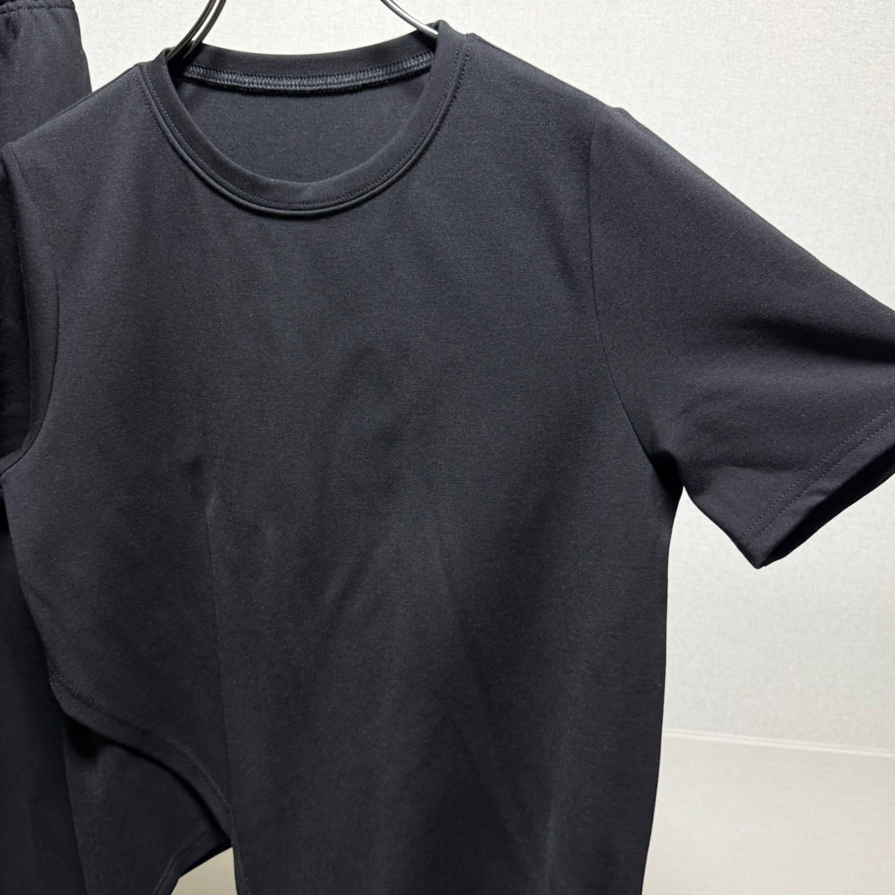 スタイリッシュな裾アシメデザインの半袖トップスとゆったりとしたワイドロングパンツのセットアップです