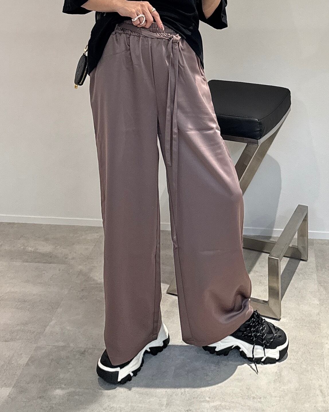 光りすぎず上品に使えるマットサテン生地を使用したワイドパンツです