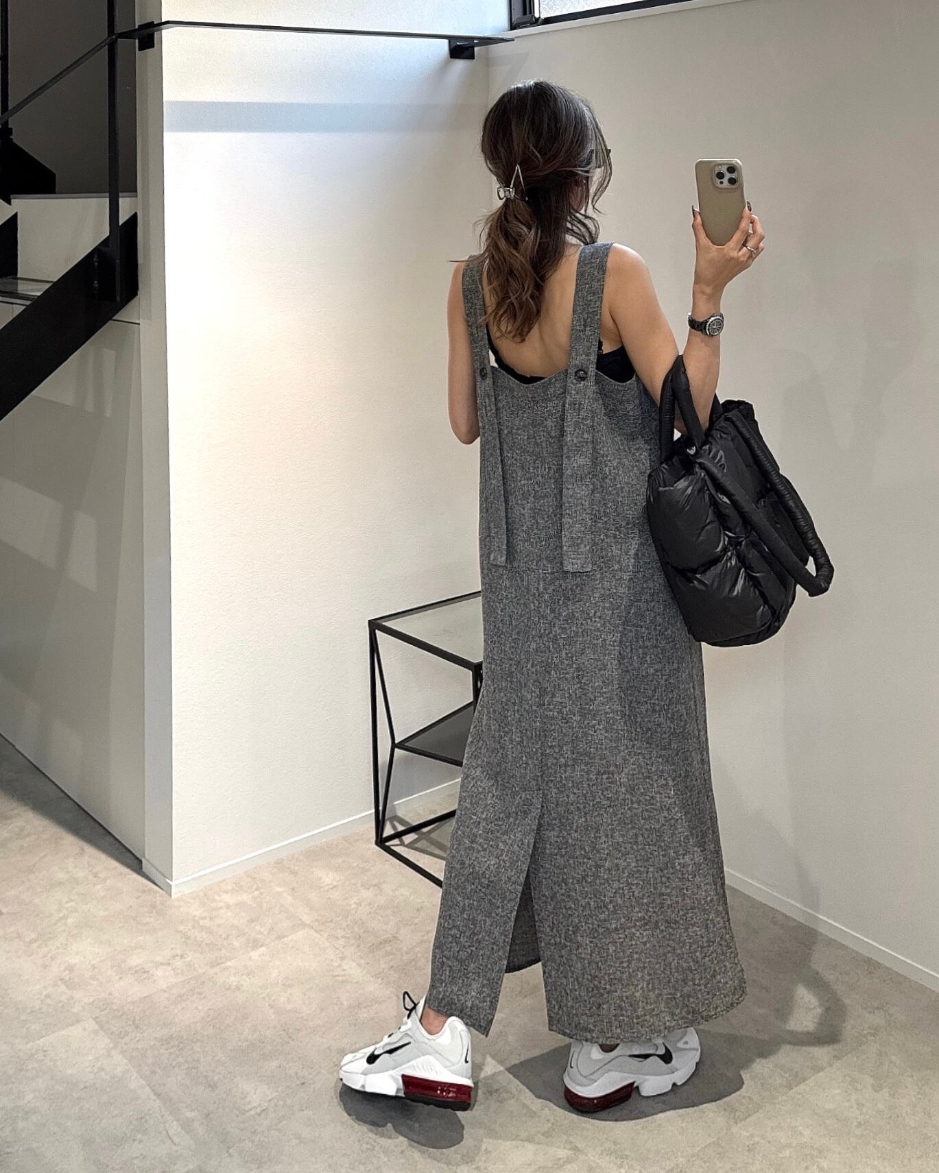 高見えするミックスツイード素材のファスナーVネックワンピースとジャンバースカートとの前後2WAY仕様