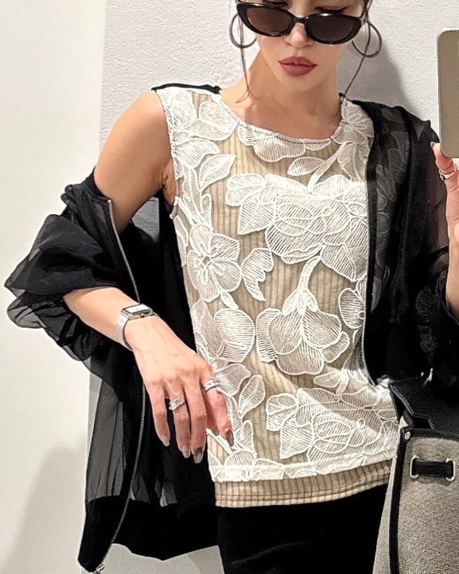 【 最終追加分 】フラワー刺繍バイカラー異素材レイヤードtops