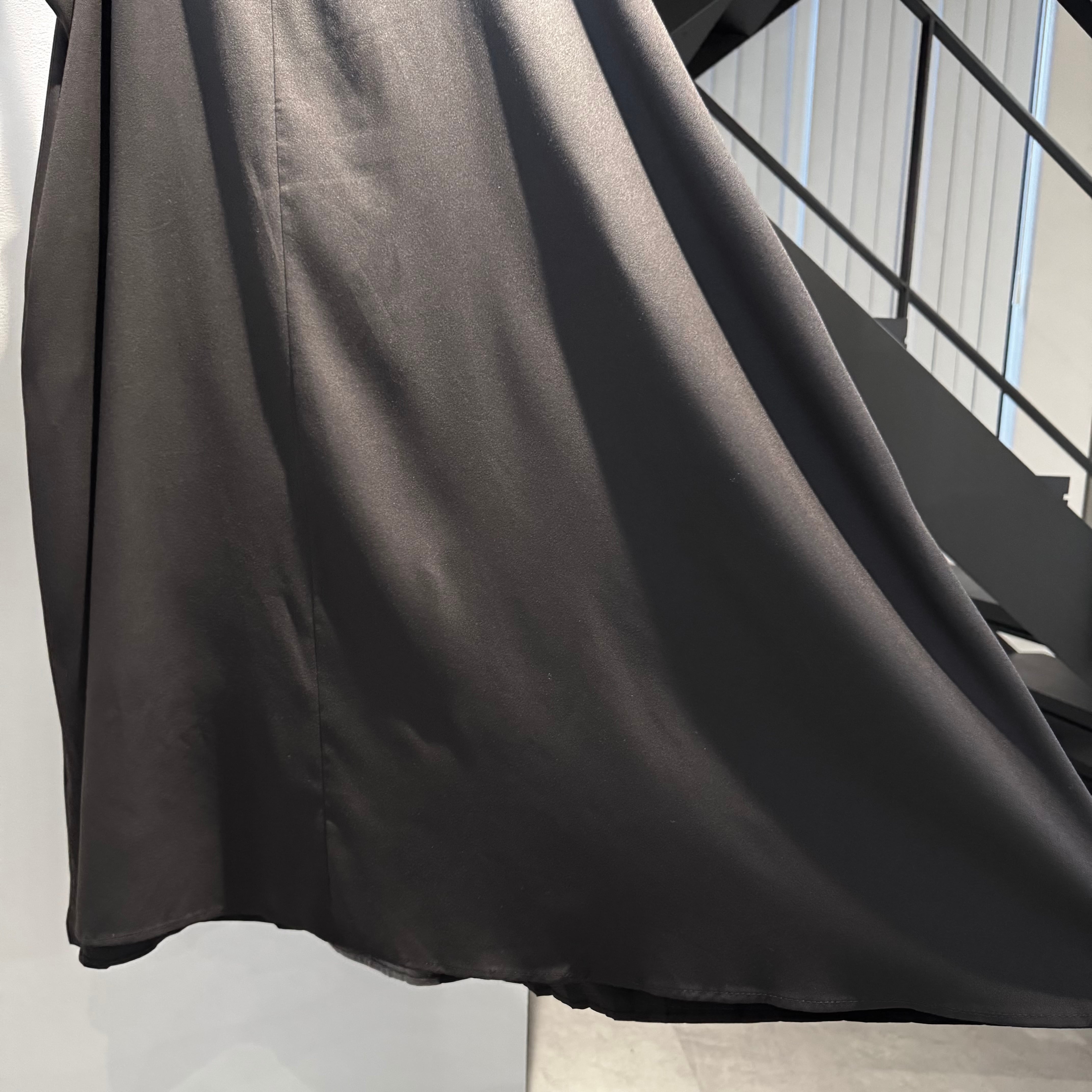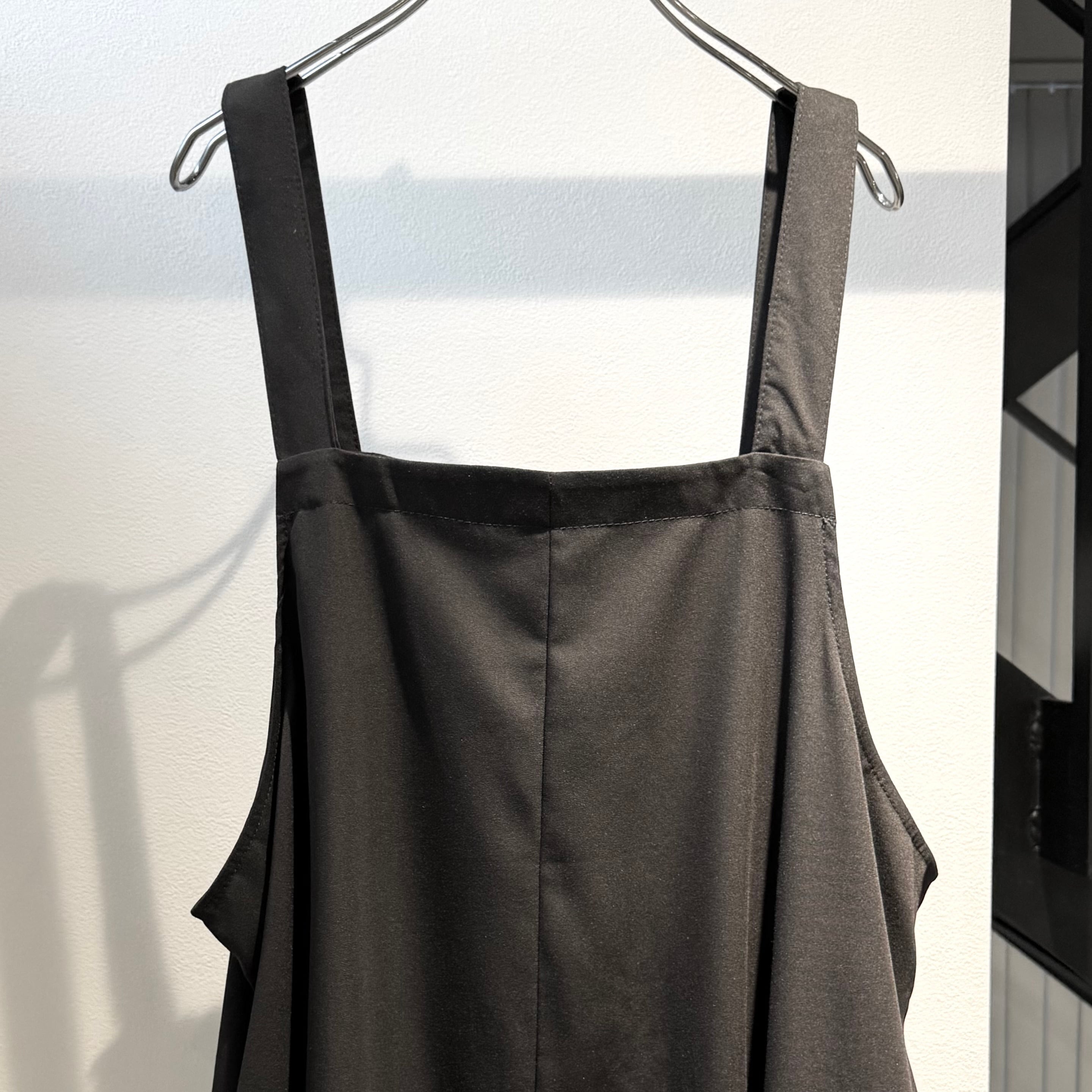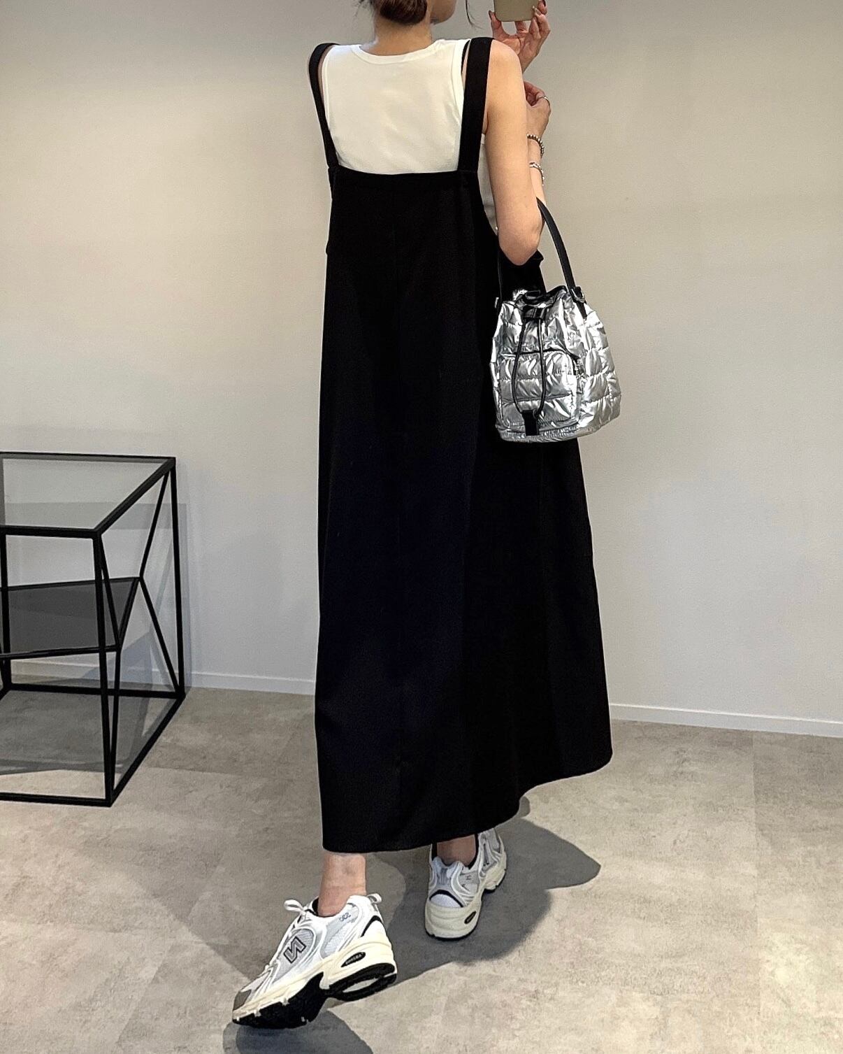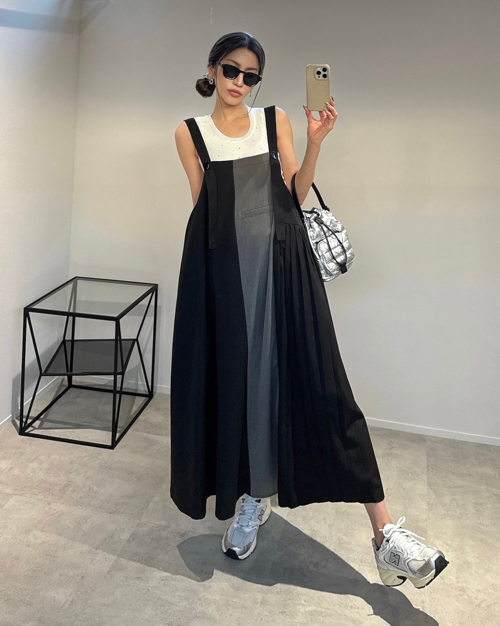 片側のみプリーツ加工が施され異素材の配色切替えが目を惹く大人のジャンバースカートです