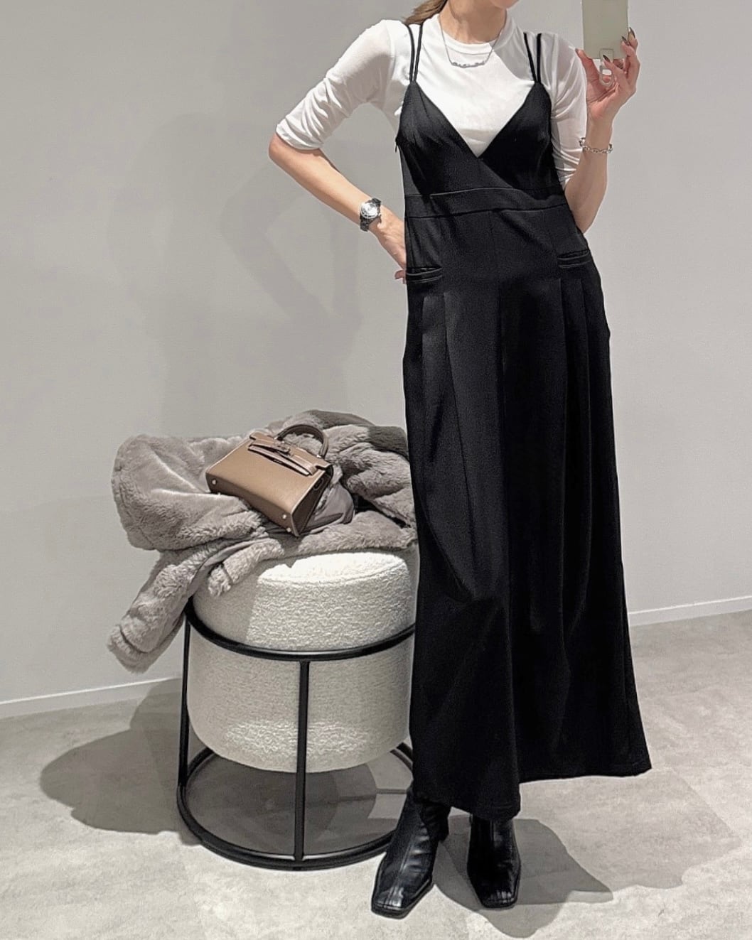 タートルニットやブラウスなど様々なトップスとレイヤードするだけで旬のコーデが完成します