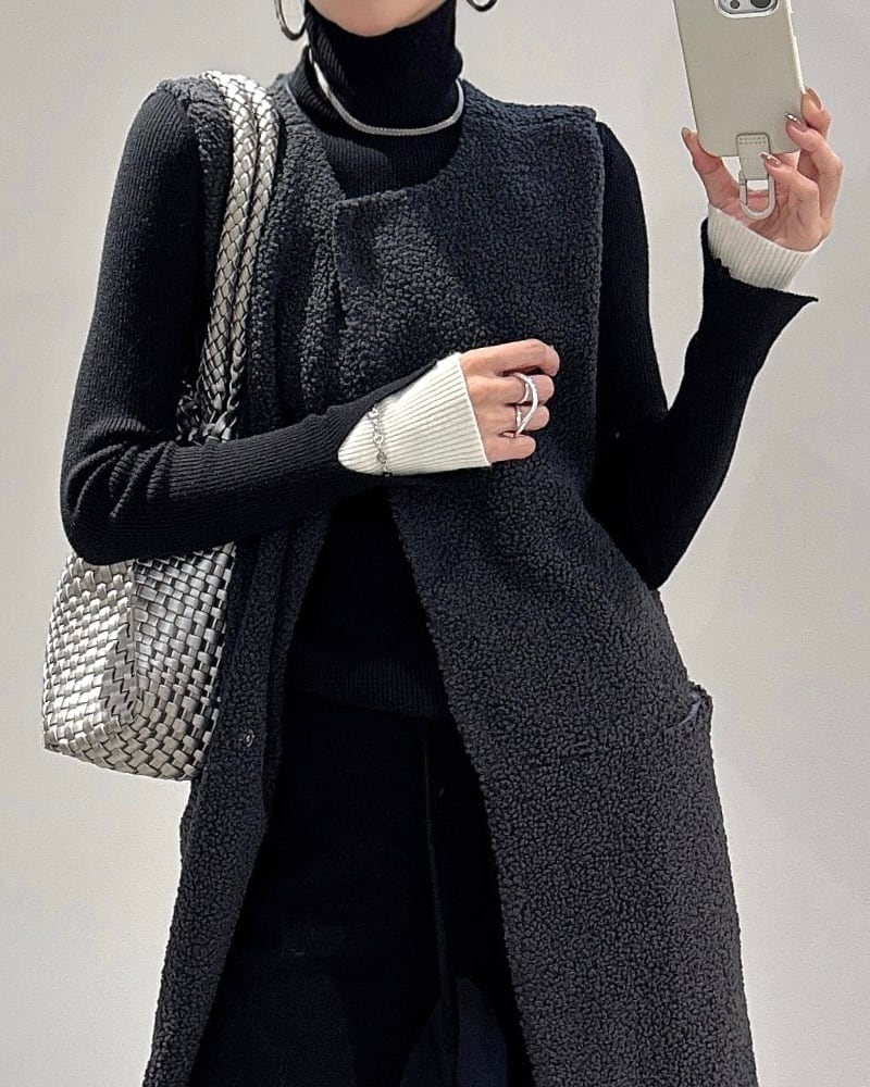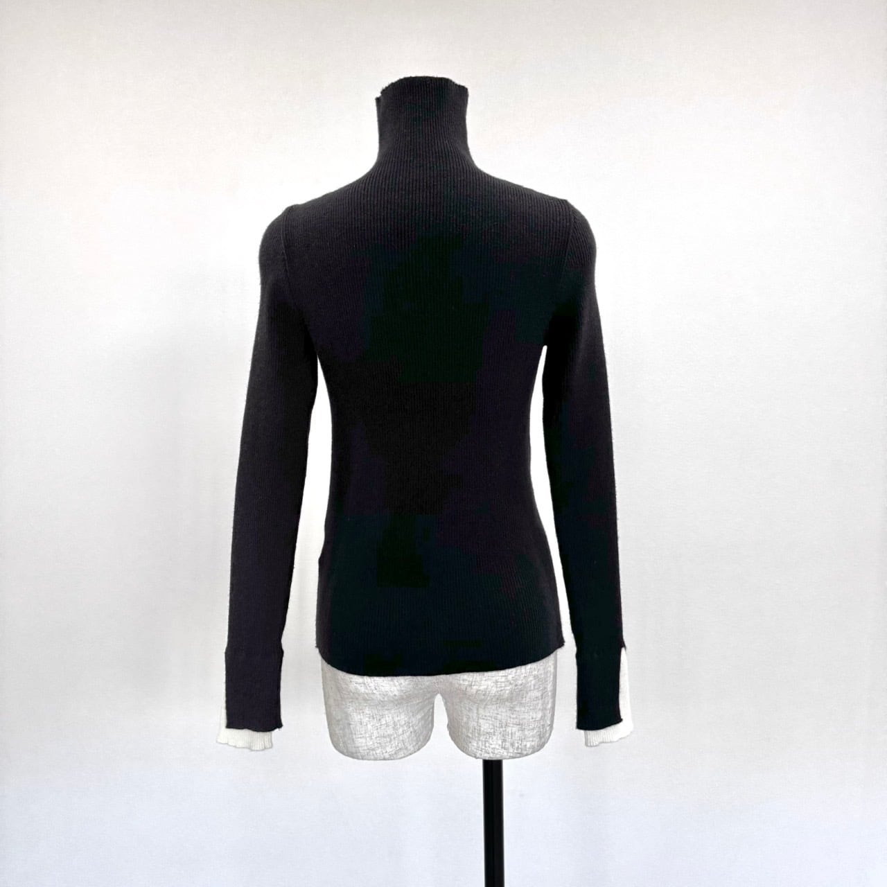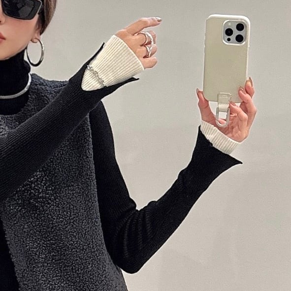 前後2wayレイヤードsleeve配色タートルknit/ブラック×アイボリー
