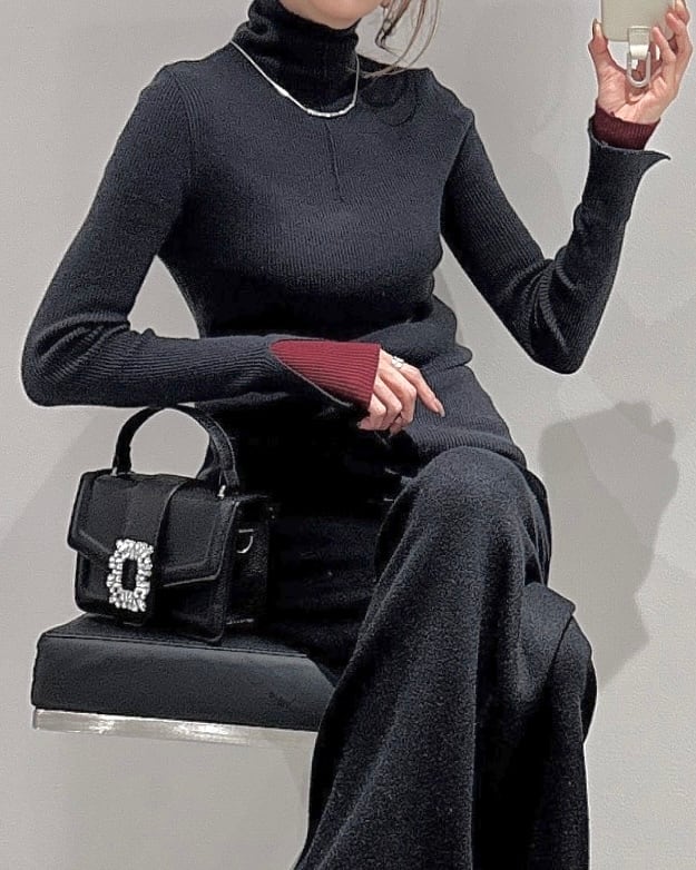 袖が配色カラーのレイヤードになった伸縮性抜群のタートルネックknitです