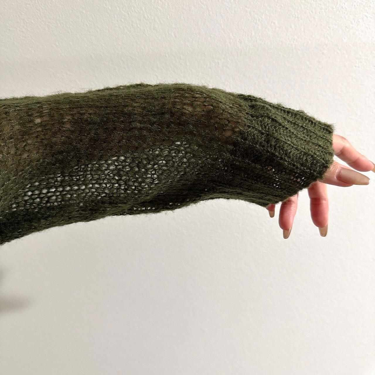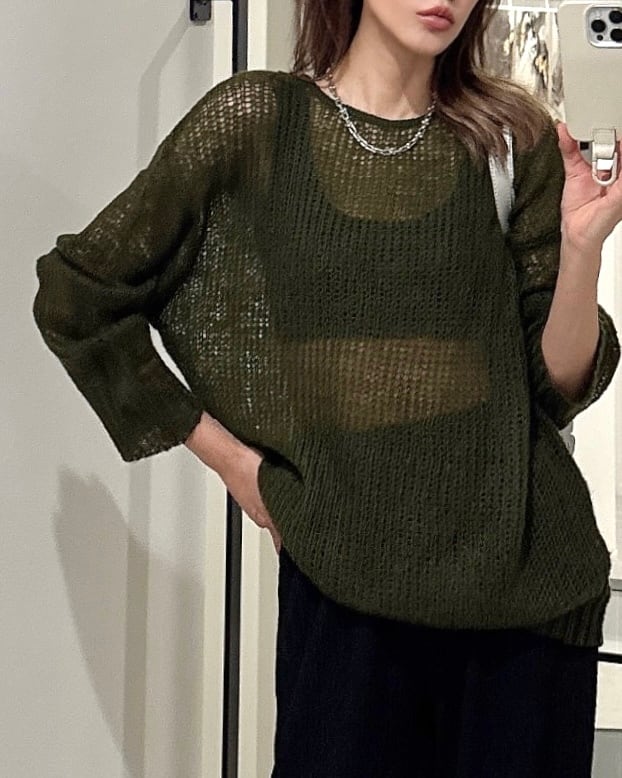 ふわふわとしたやわらかいモヘヤタッチの編地のシアーニットです