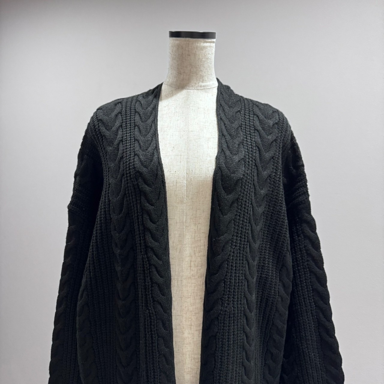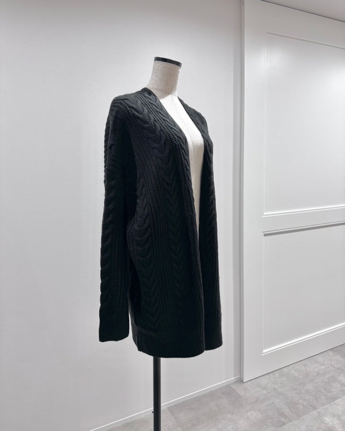 ボタンのないすっきりとした印象のトッパータイプのケーブルカーディガンです