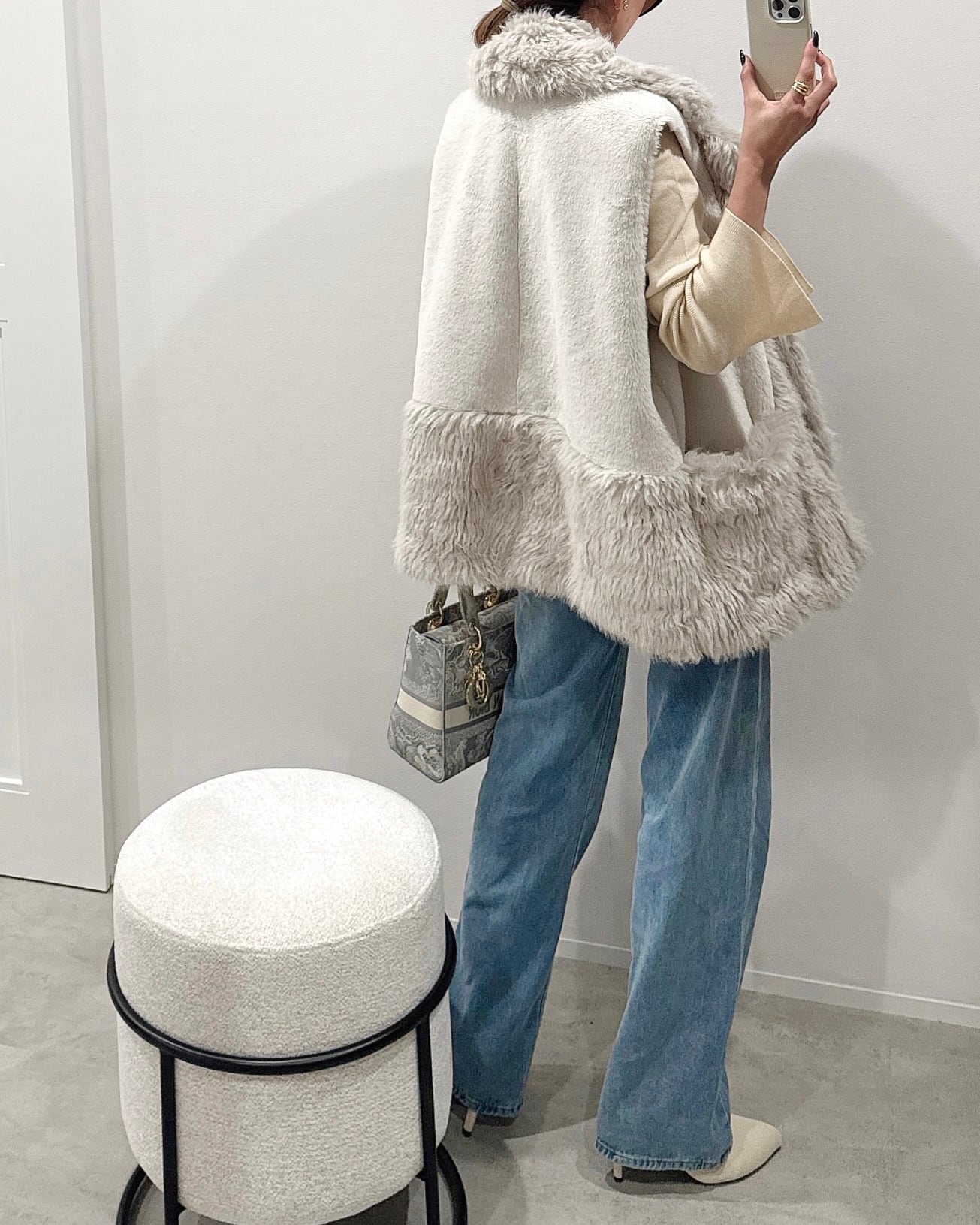 長い毛足と短い毛足の異なるファーを部分的に切り替えた周りと差のつく高級感あふれるファーベストです