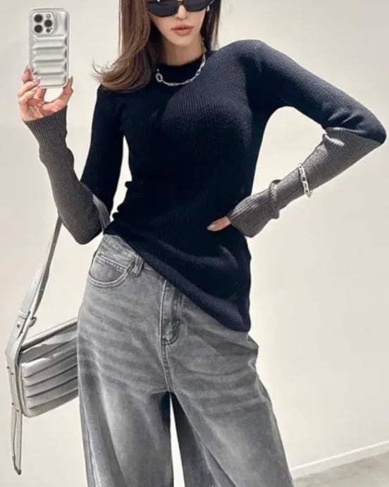 指先まで抜かりなく華やぐ動くたびに袖口ラメの輝きをまとった大人のためのリブニットです