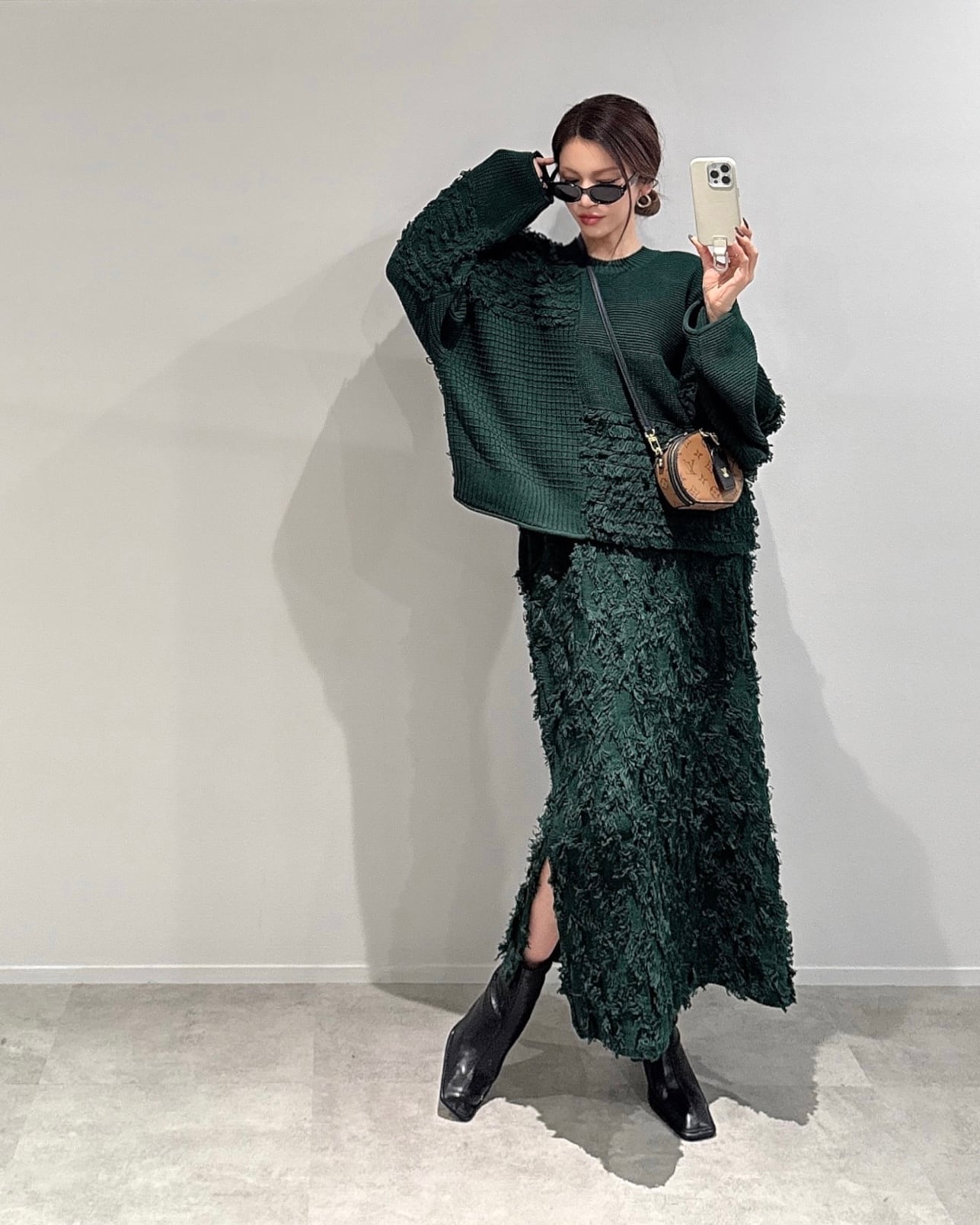 スカートはランダムに走るループヤーンの立体感が印象的で、動くたびにふわりと揺れる軽やかなテクスチャーが魅力