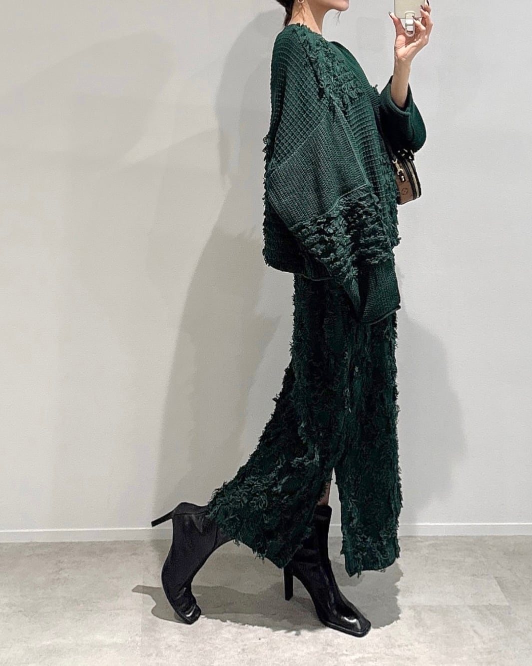 表情豊かな編み地とフリンジが印象的なループジャガードニットプルオーバーとストレートシルエットニットスカートのセットアップ商品です