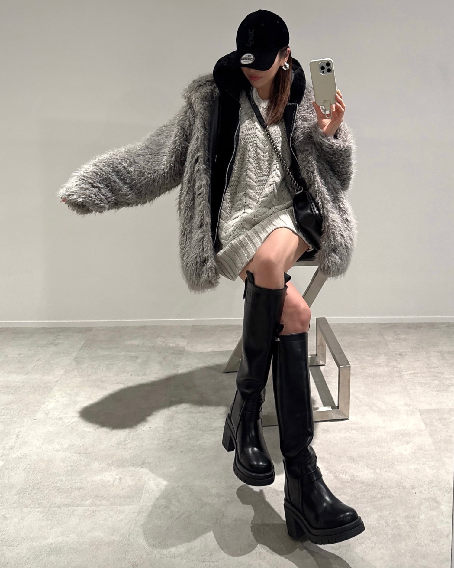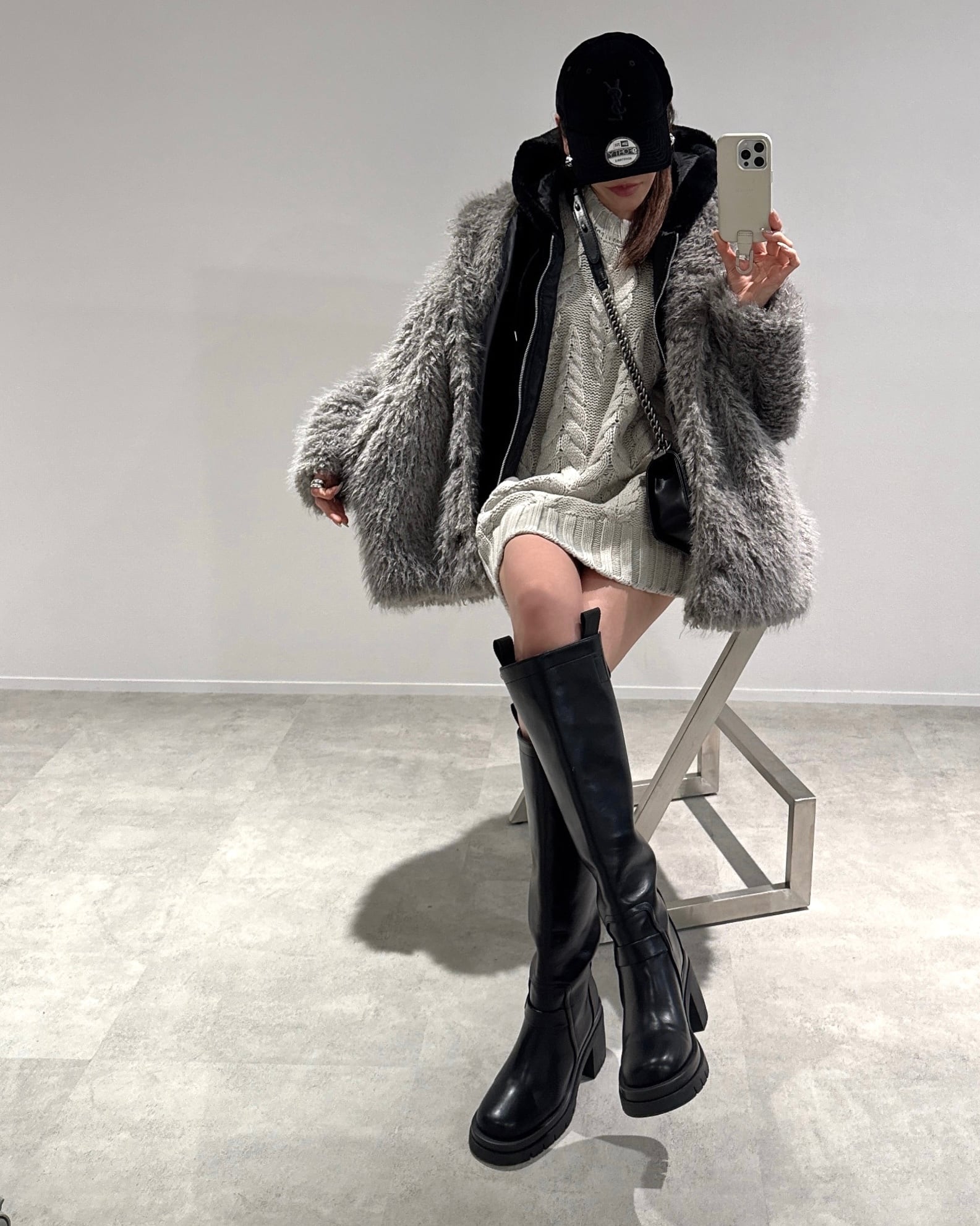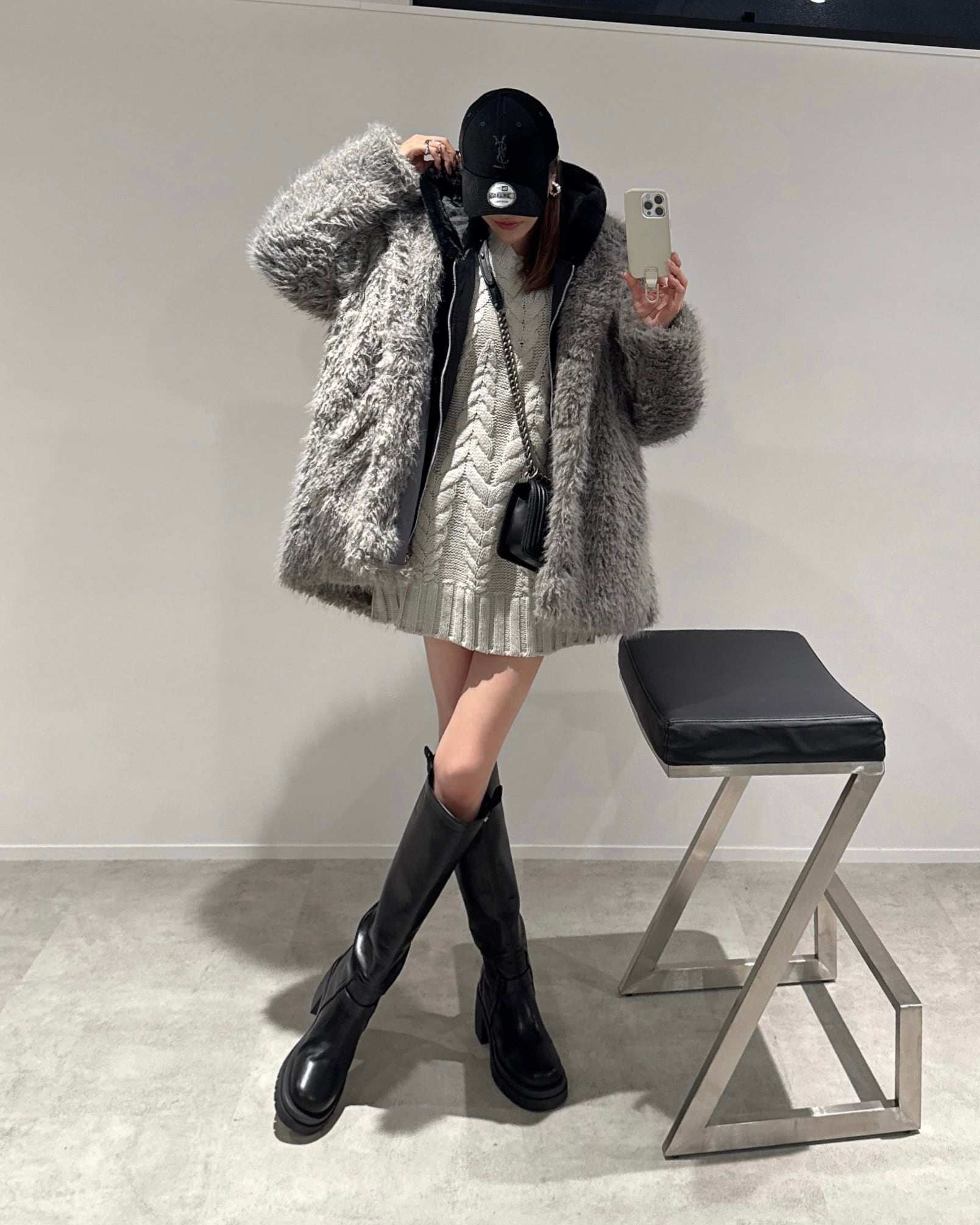 柔らかなプードルシャギーファー素材のAラインタックスタンドコートです