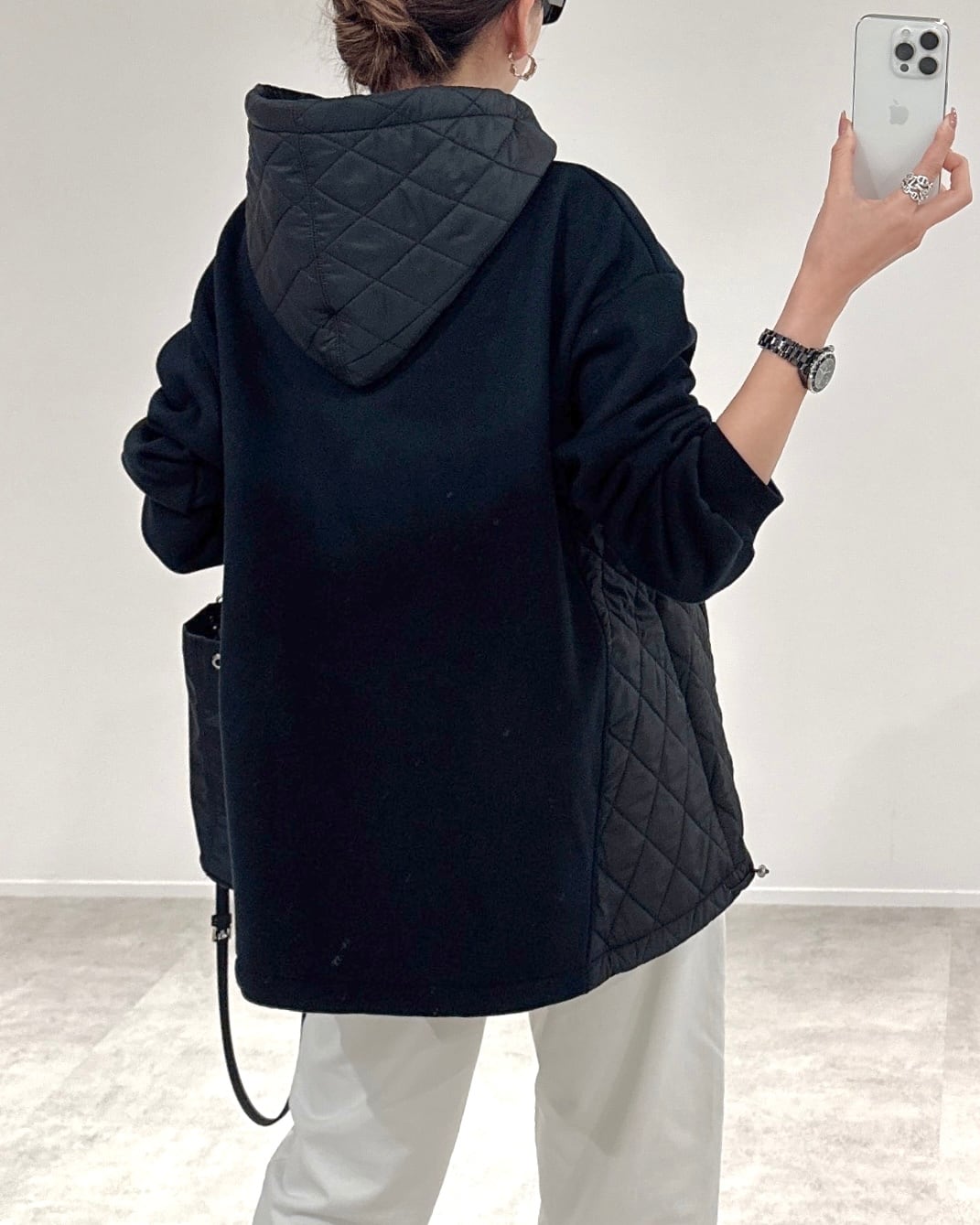 フードと脇の切り替え部分をキルティング素材に仕立てたゆるっとシルエットのあったか裏起毛パーカーです