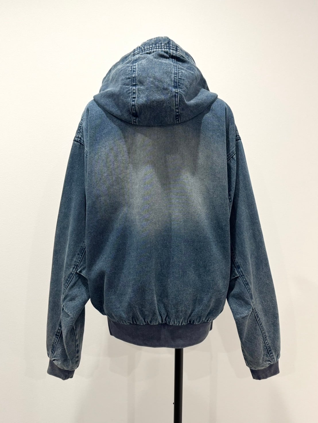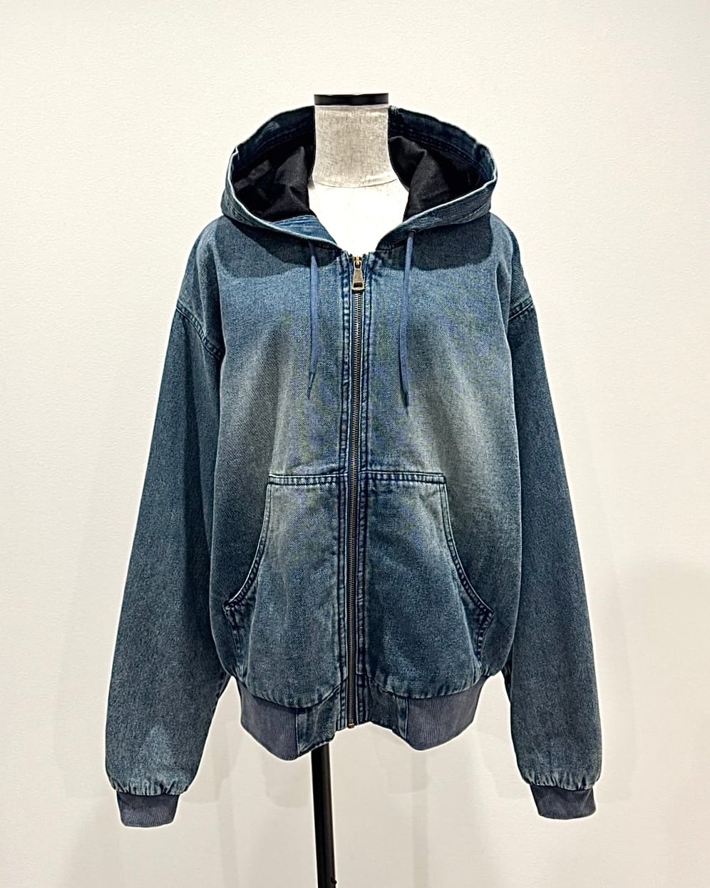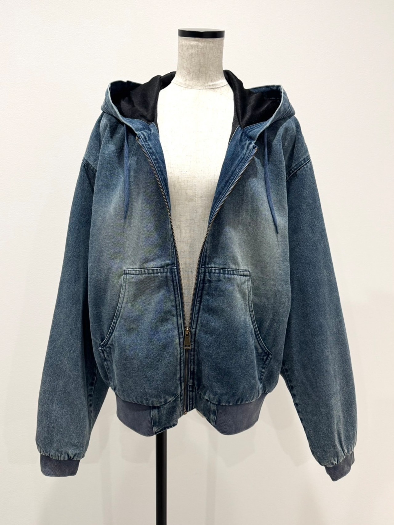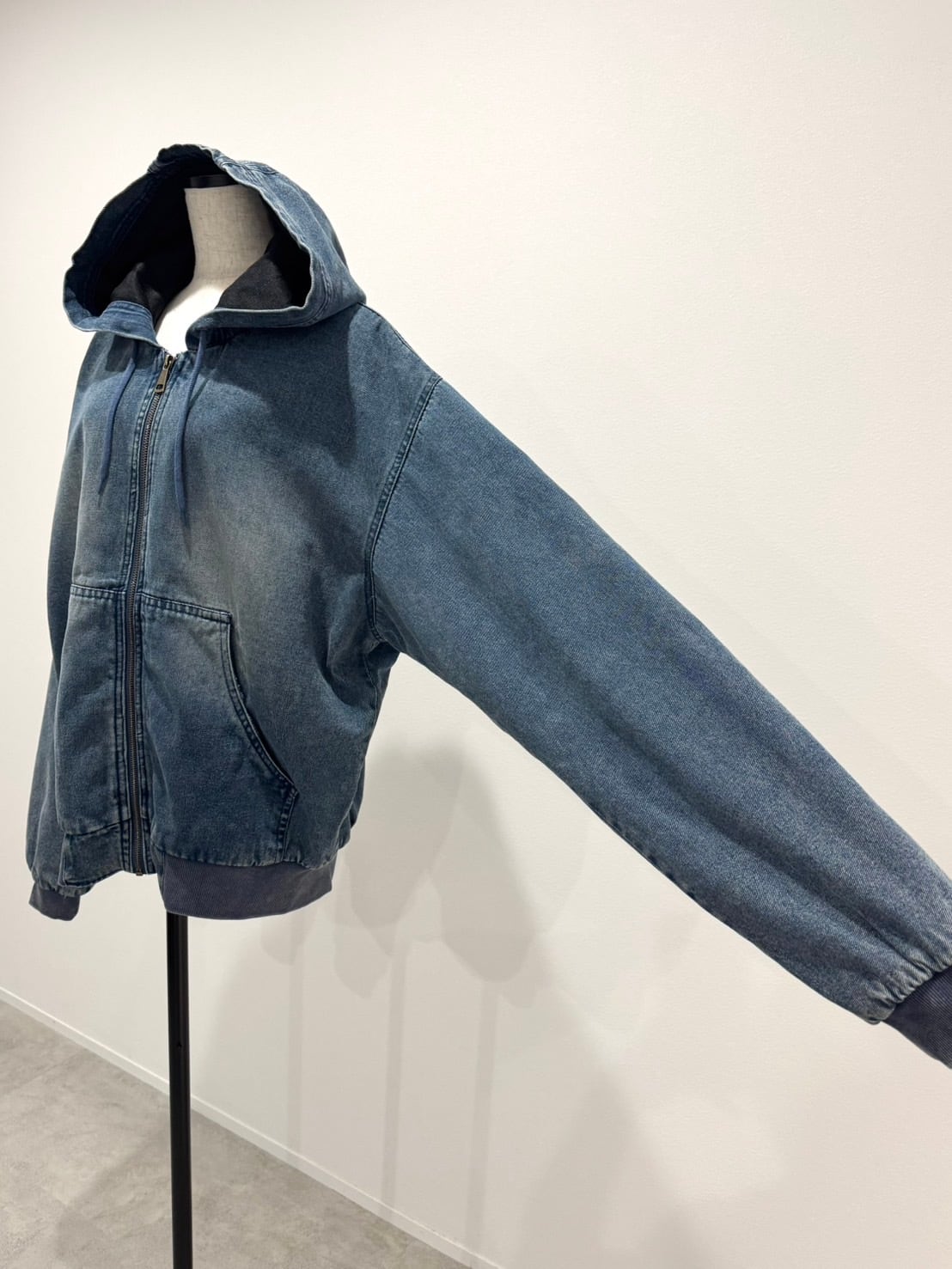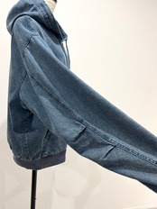 中肉のボンディング裏地つきブラスト加工デニムフードジャケットです