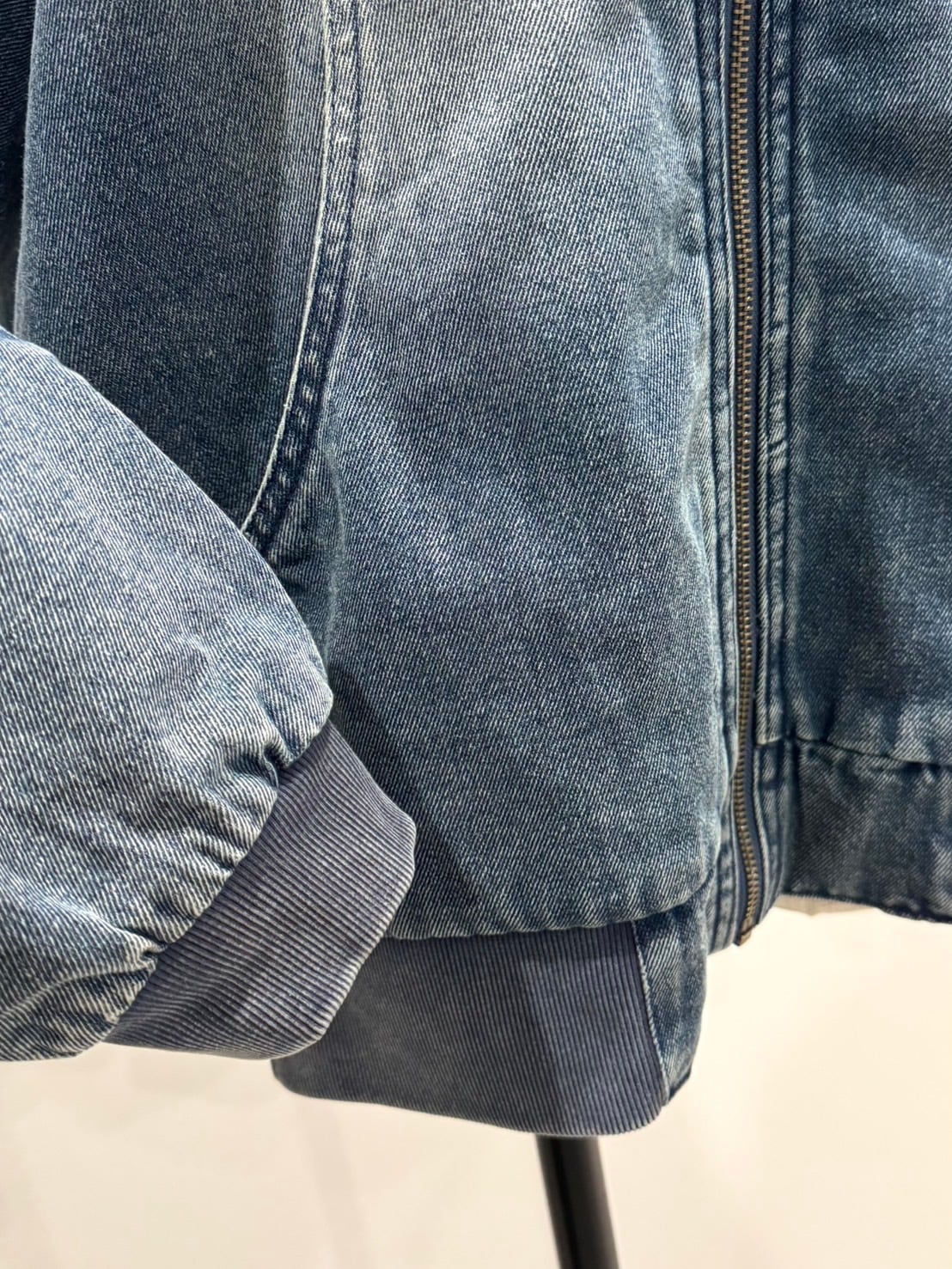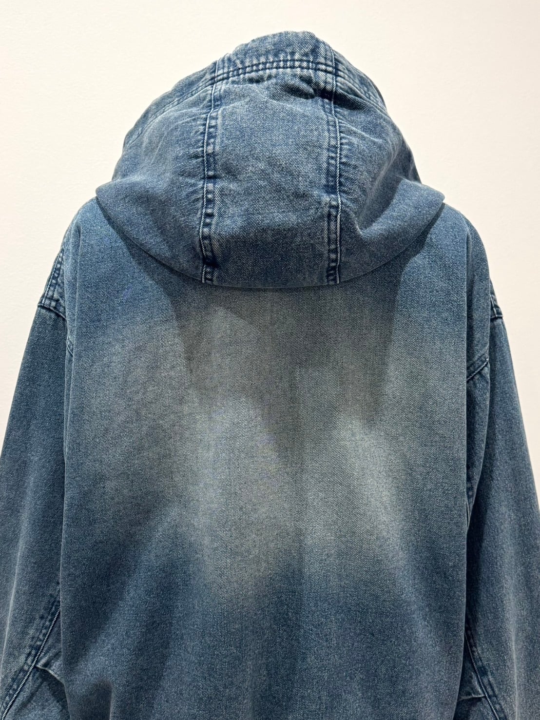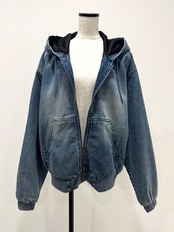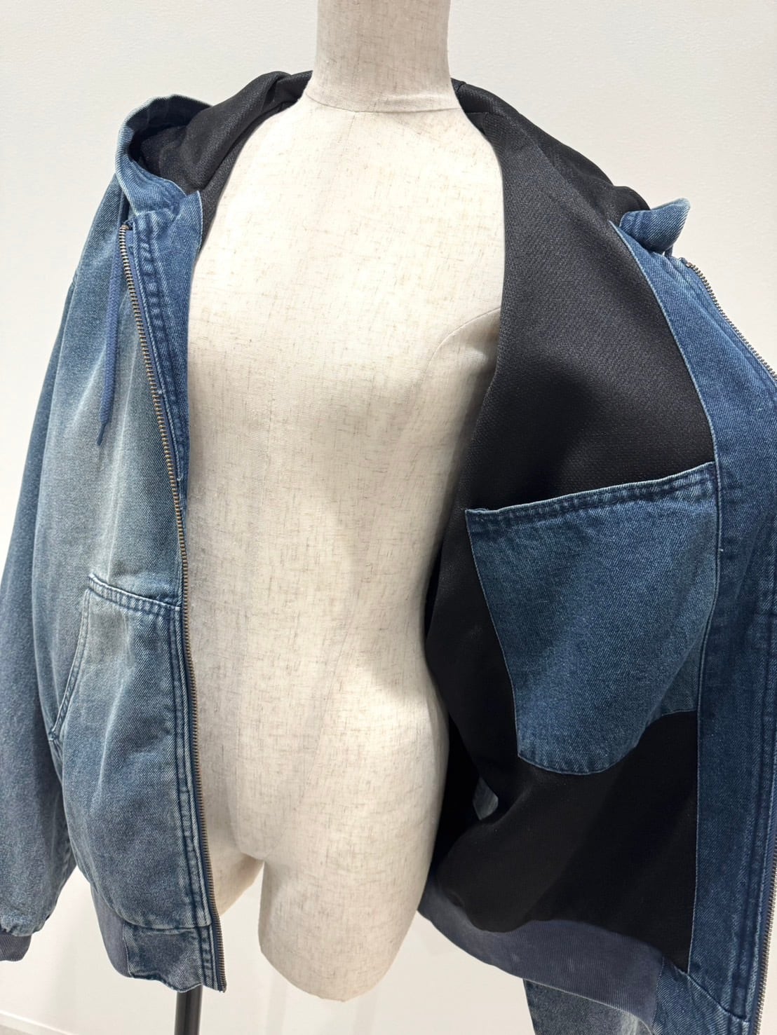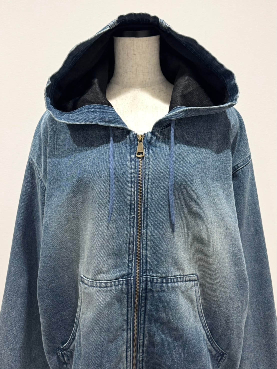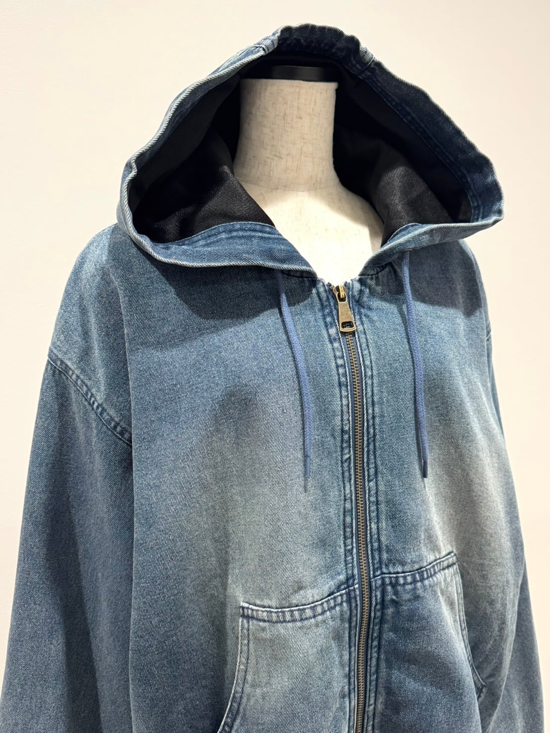 中肉のボンディング裏地つきブラスト加工デニムフードジャケットです