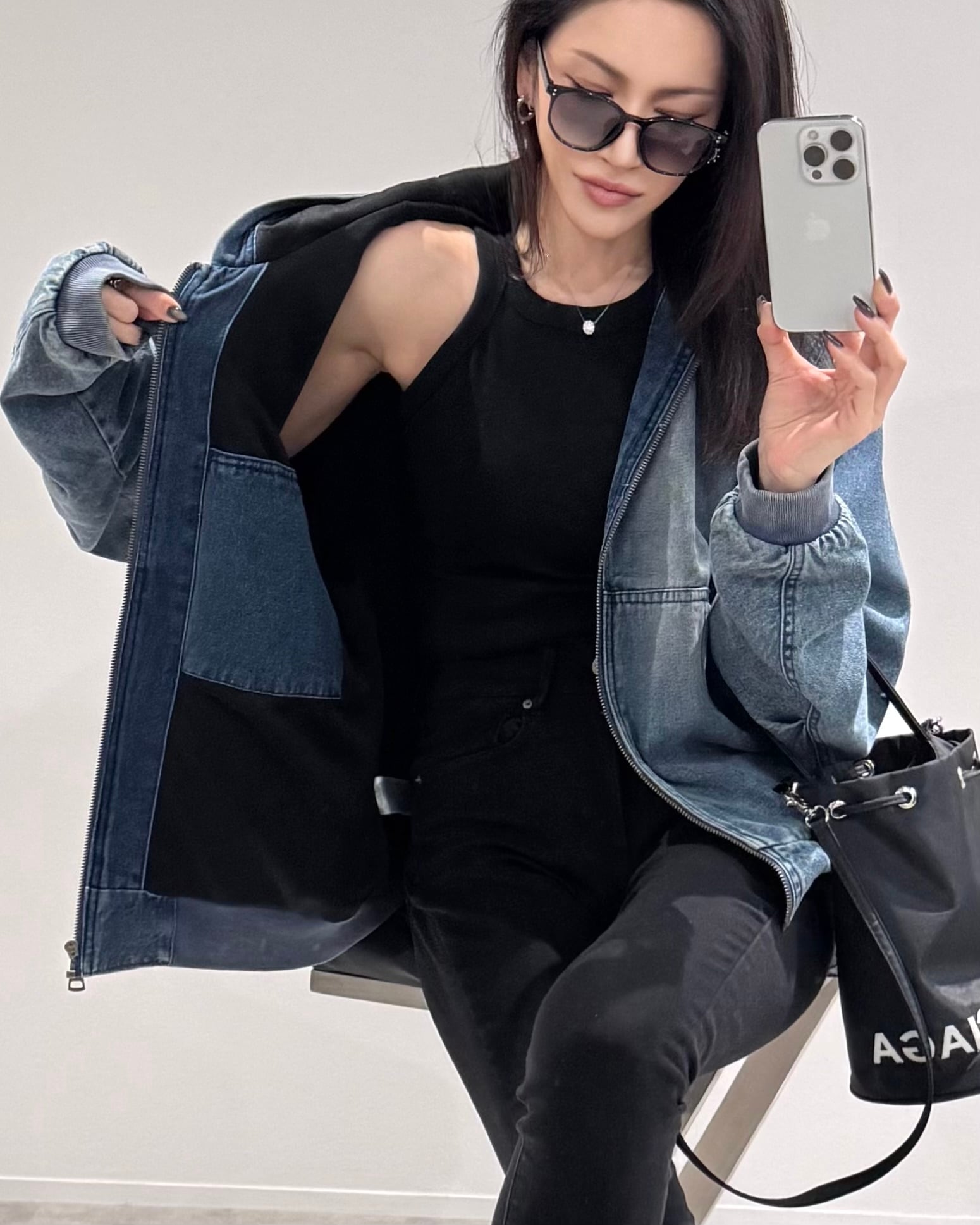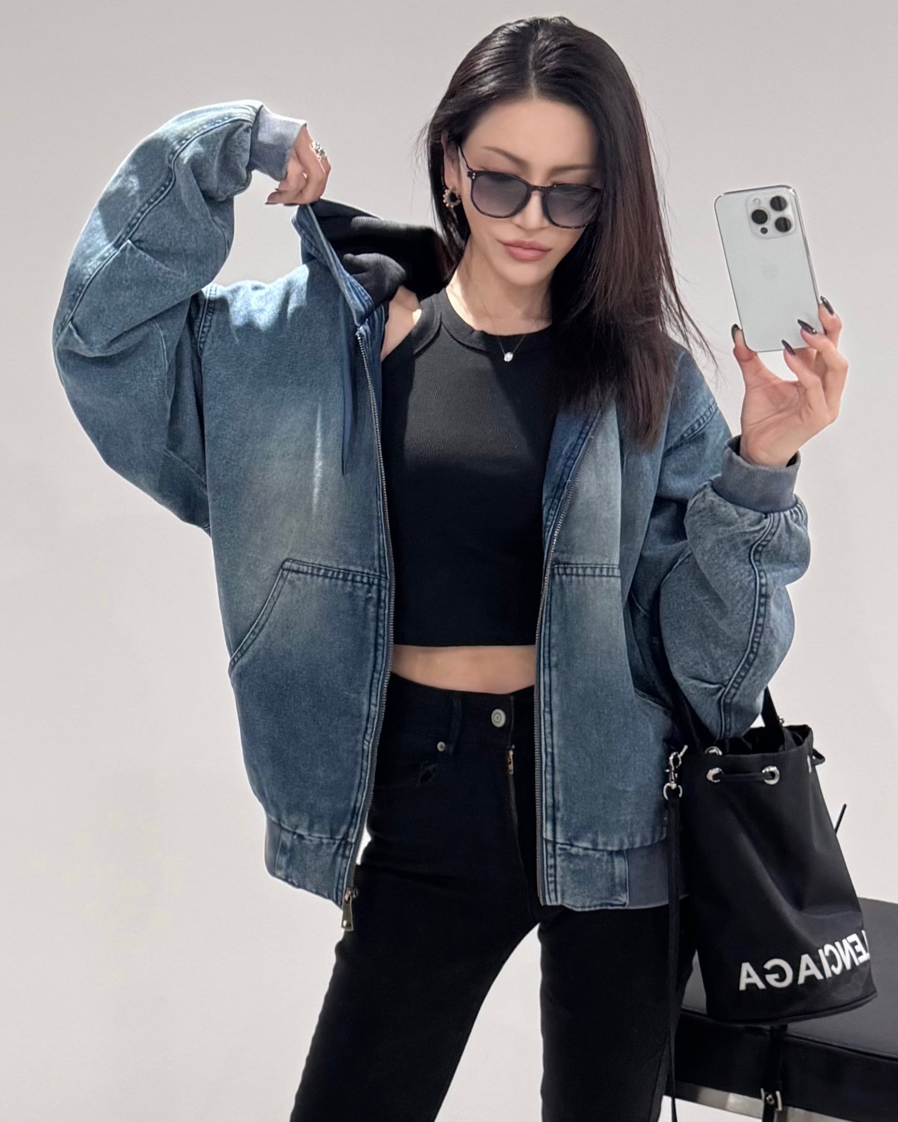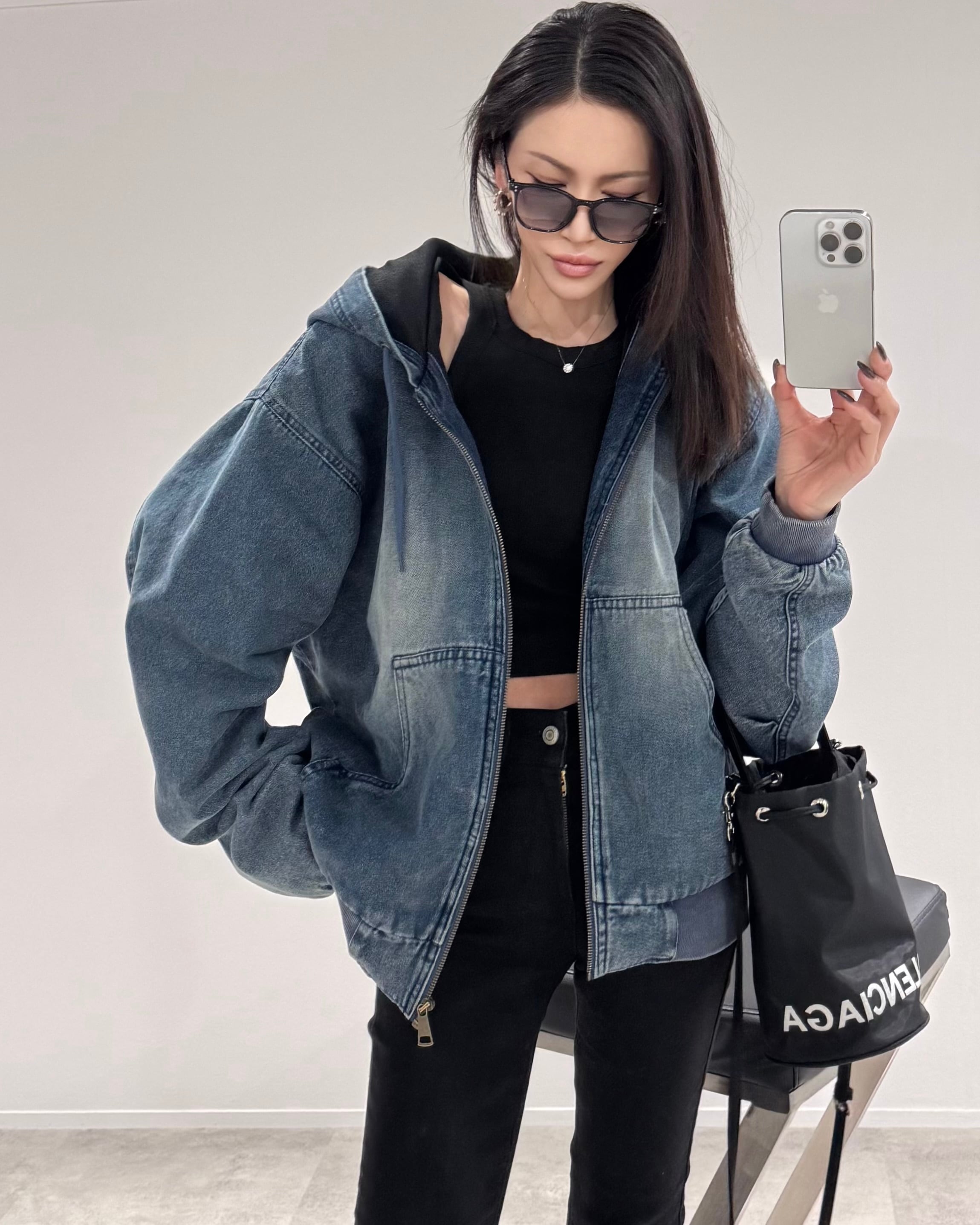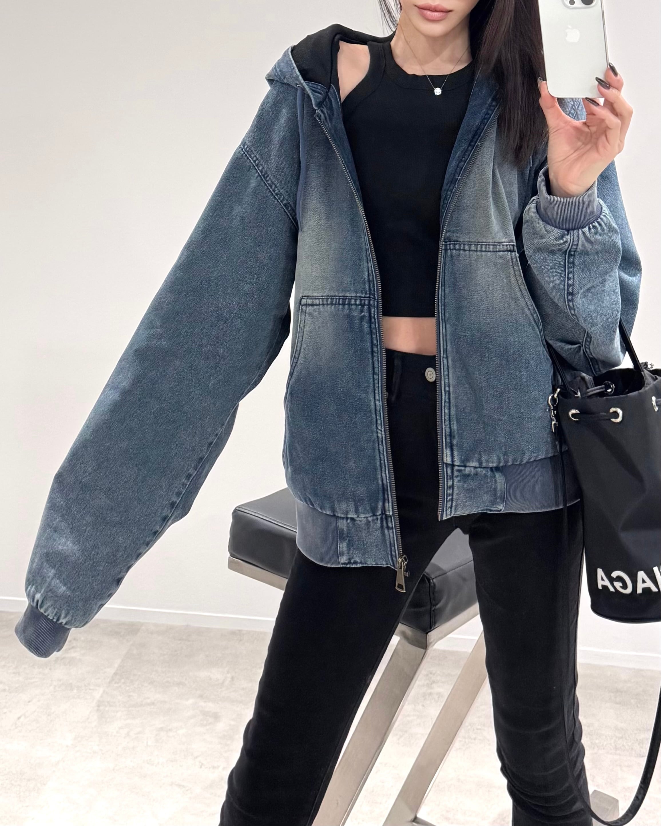 中肉のボンディング裏地つきブラスト加工デニムフードジャケットです