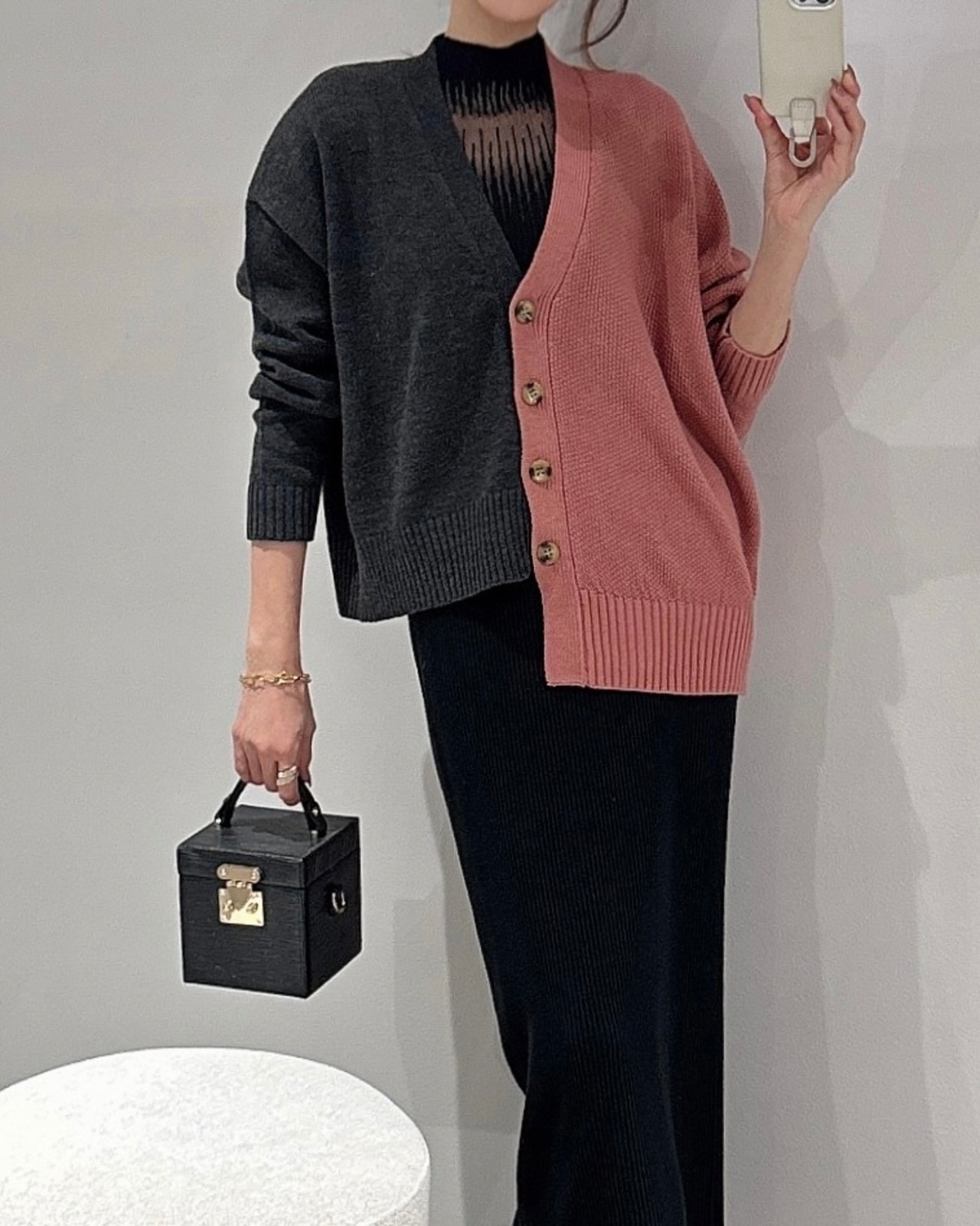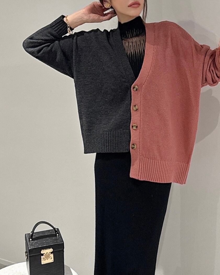 左右でカラーや丈感が異なるので着るだけでお洒落な周りと差がつくカーディガンです