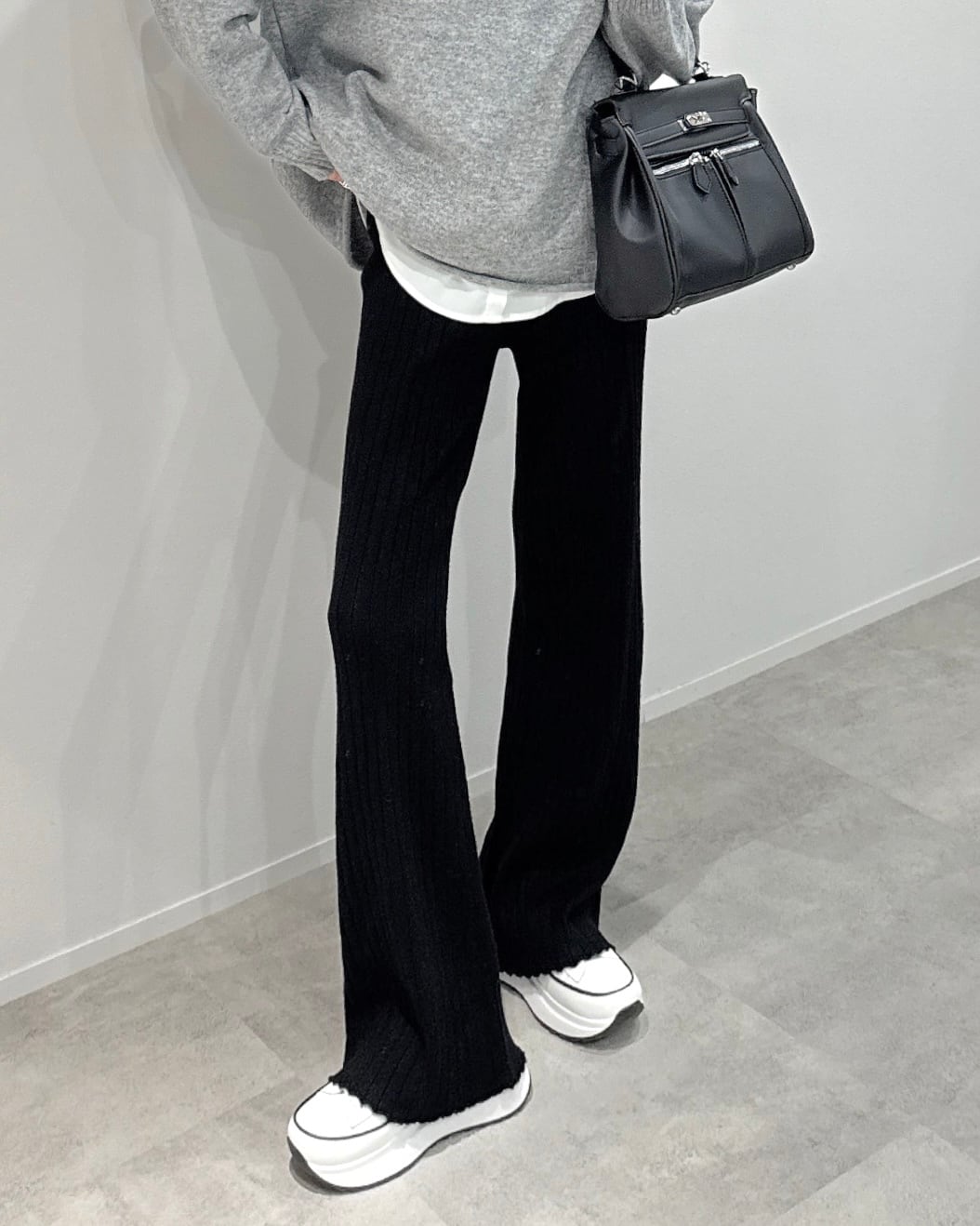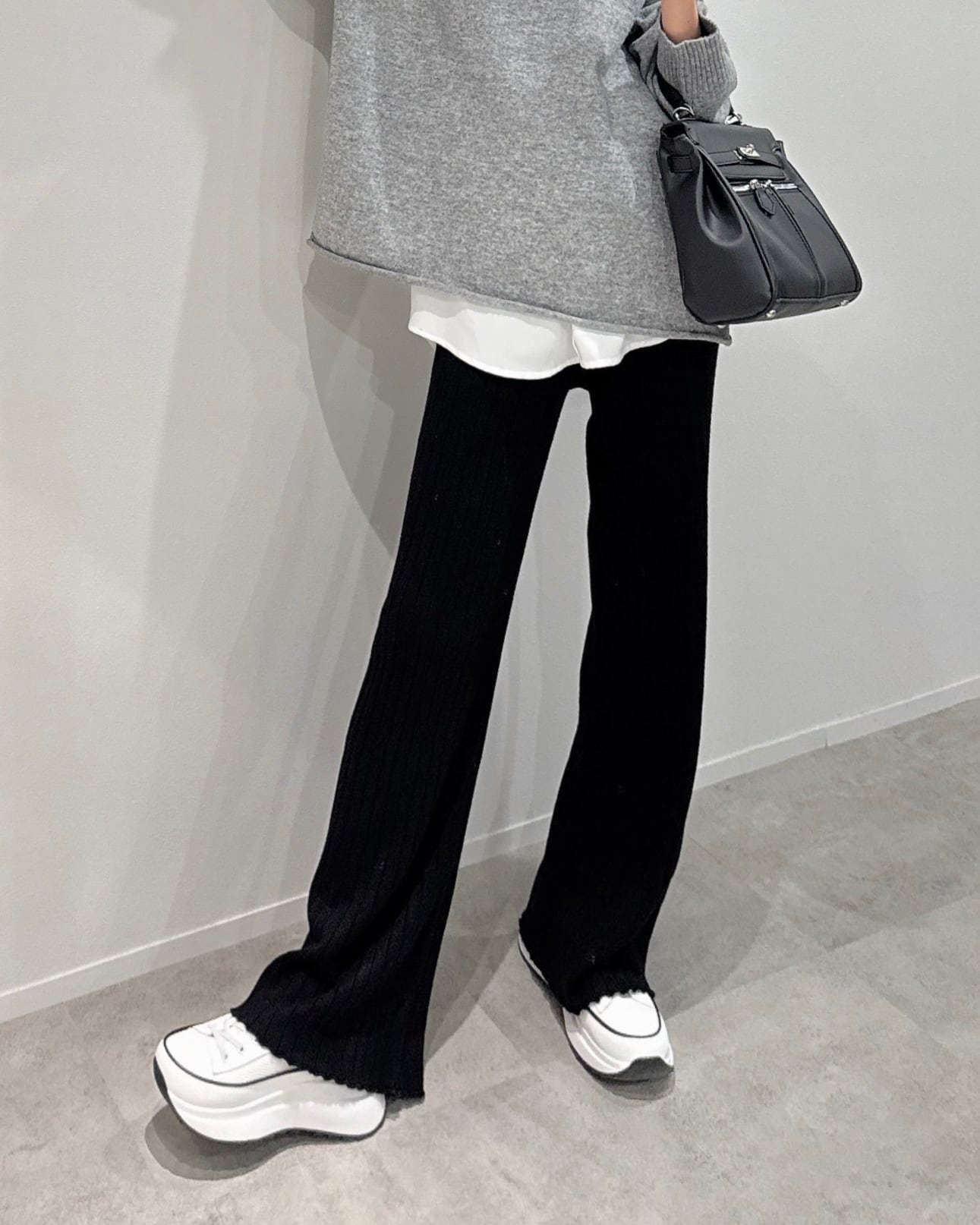 裾に向かって広がるセミフレアな美シルエットがポイントのやや太めのリブニットパンツです