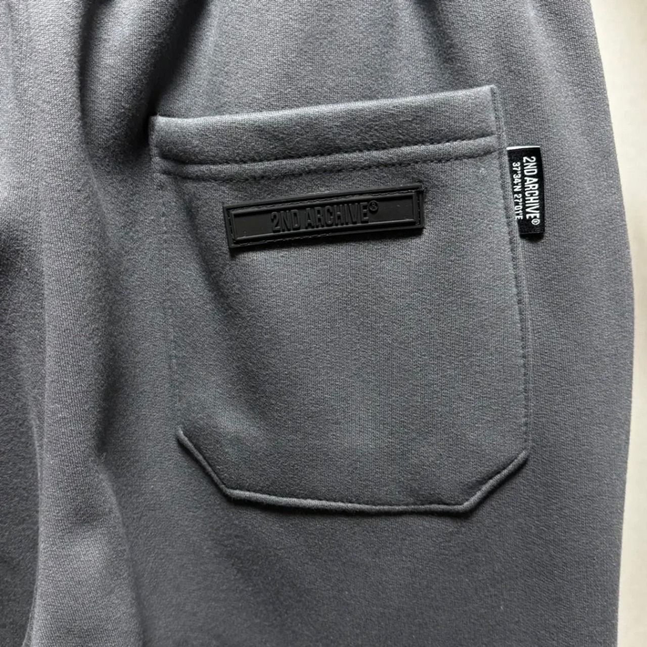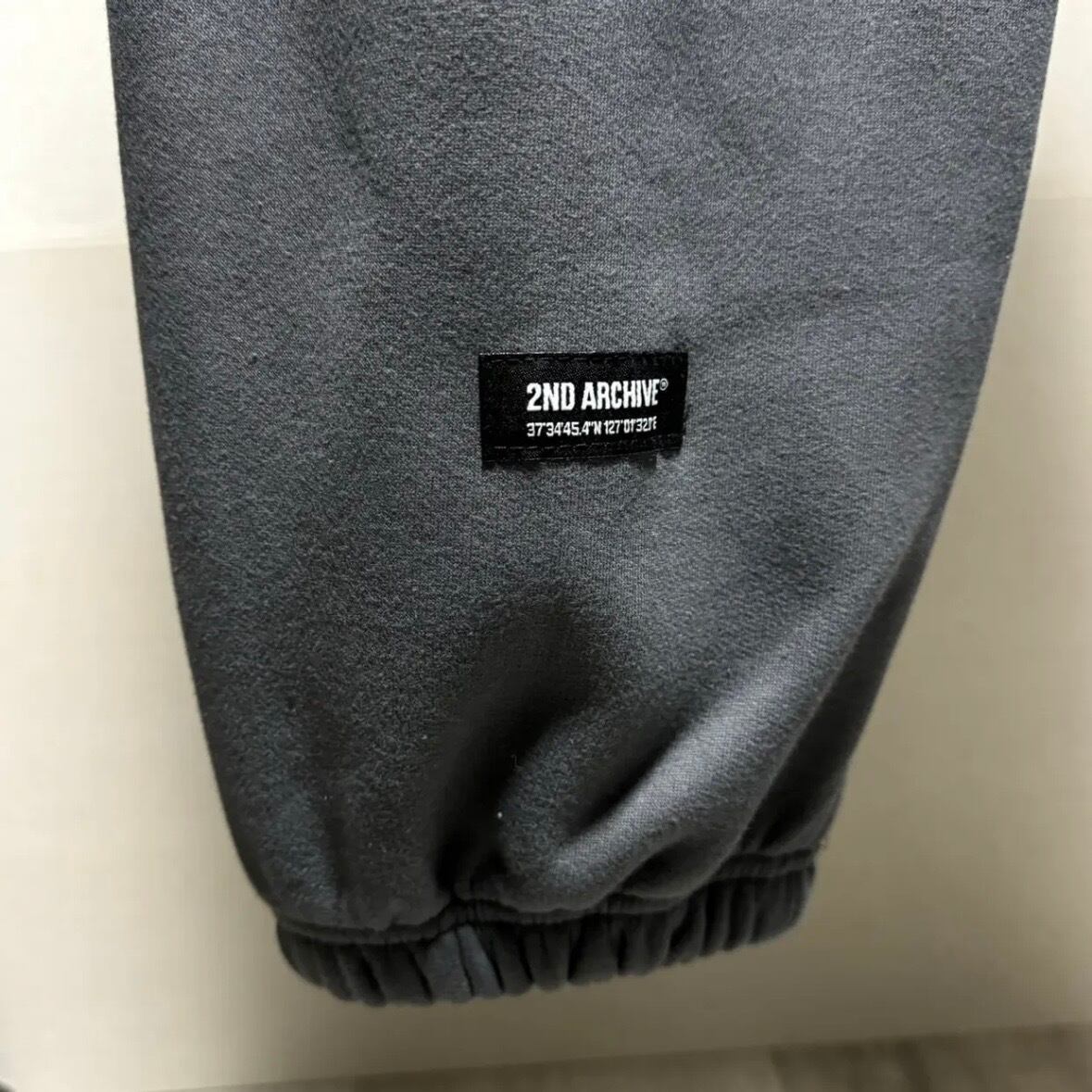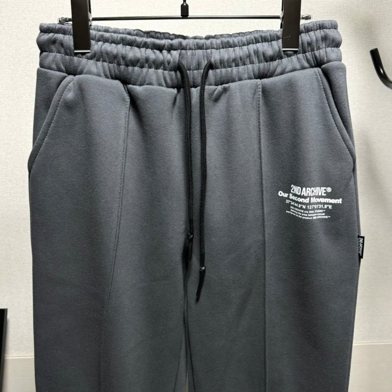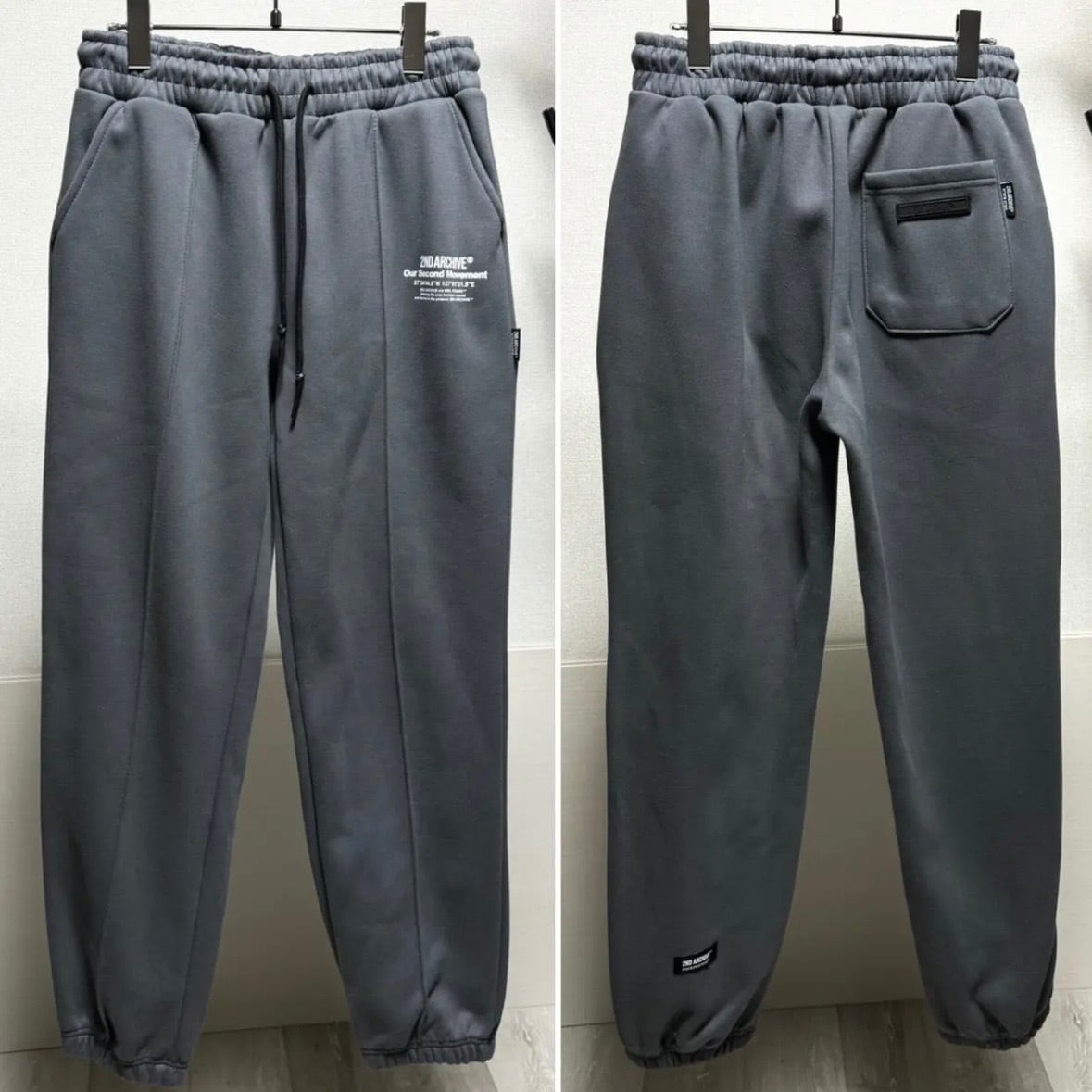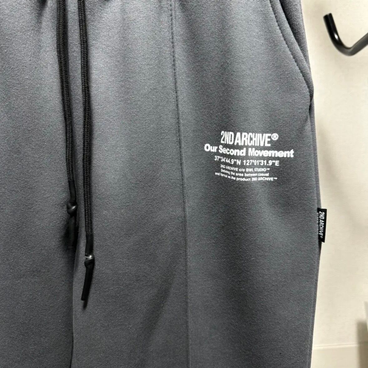 パーカーのフード紐にもロゴがあしらわれており、ボトムスはセンターシーム入り