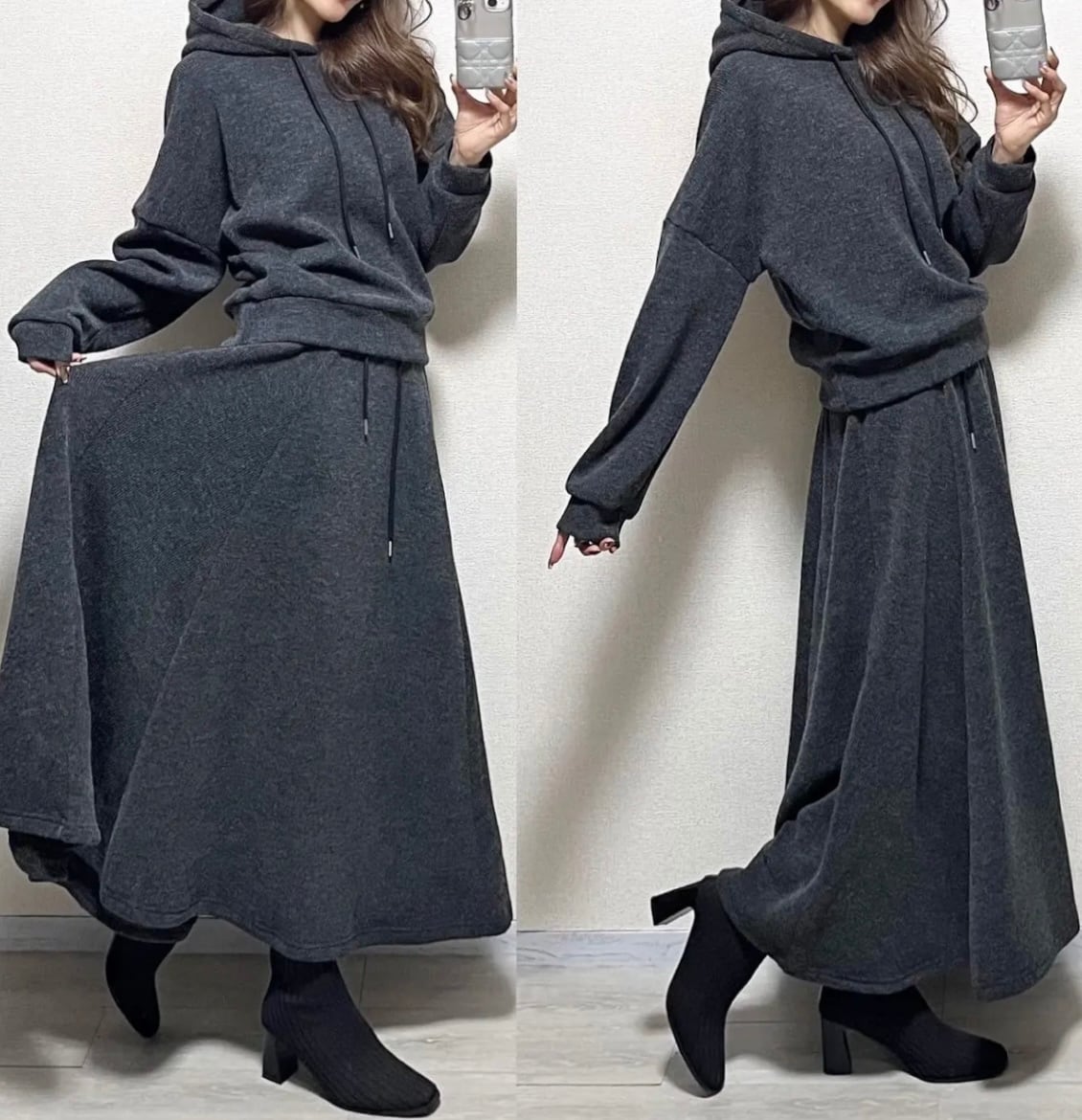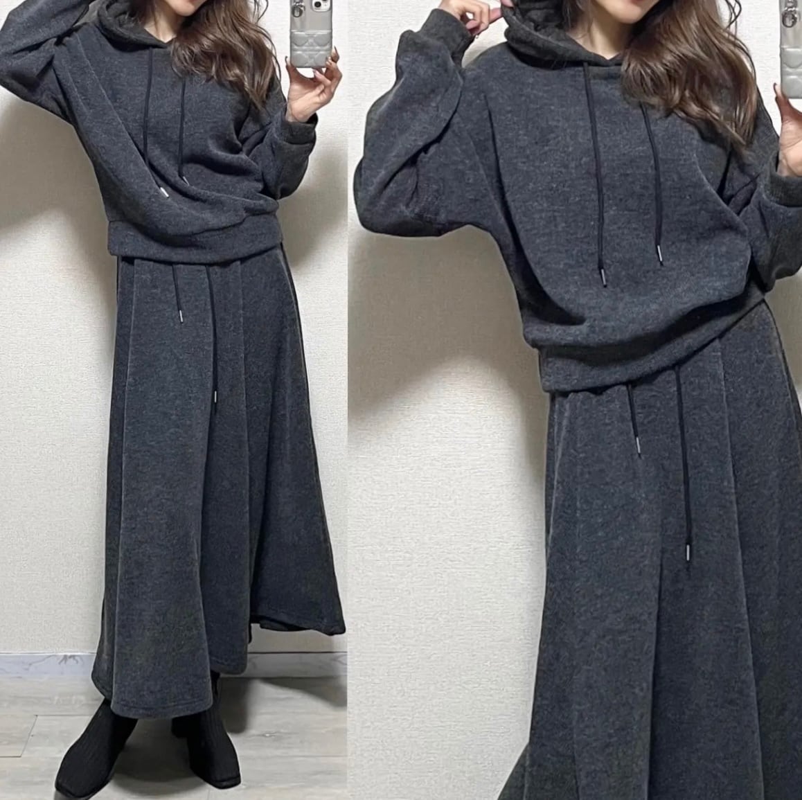 knit スウェットパーカー×フレアスカート/セットアップ/チャコール