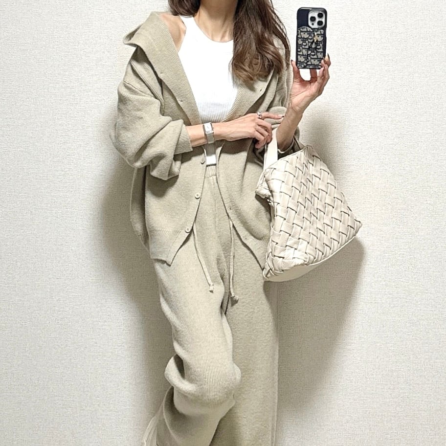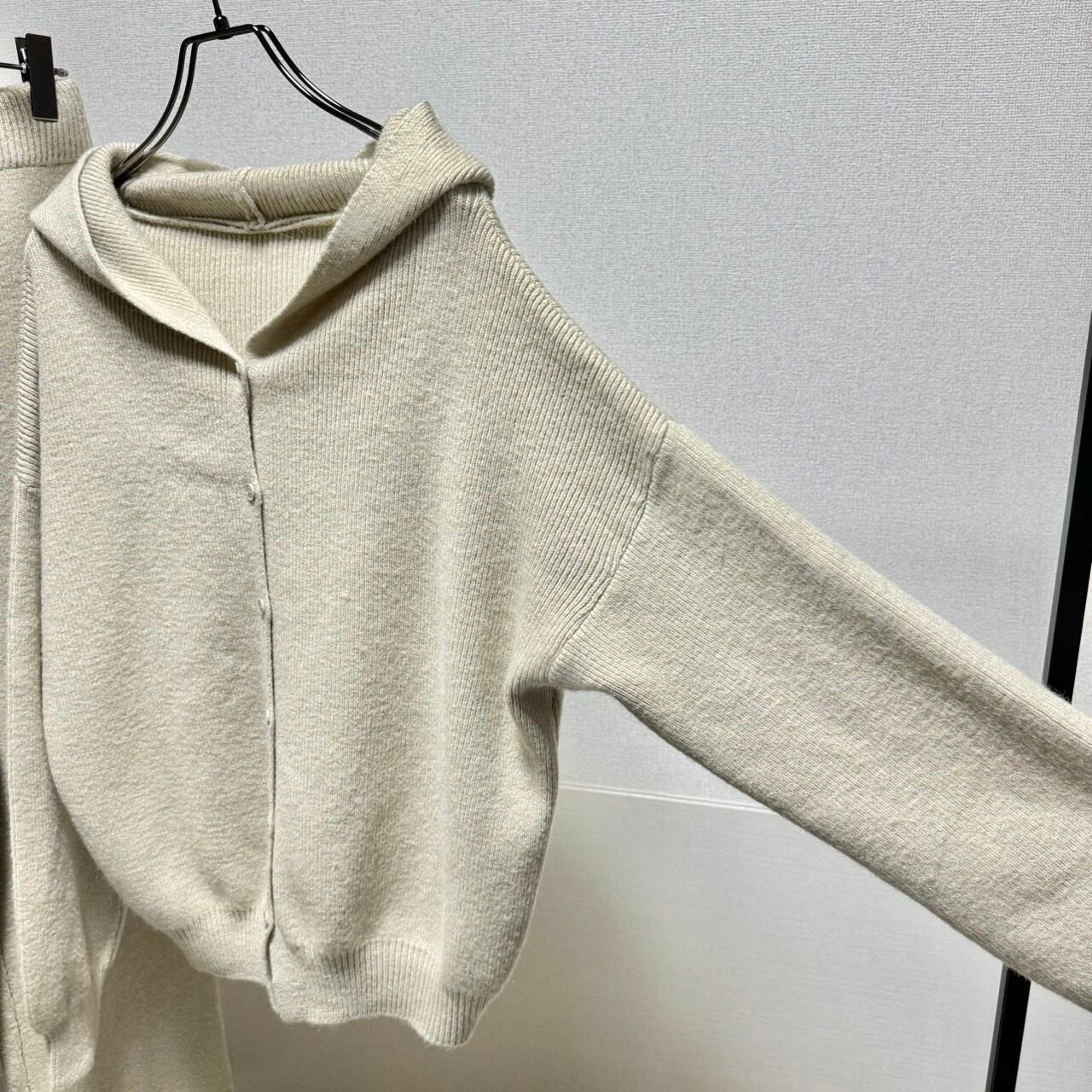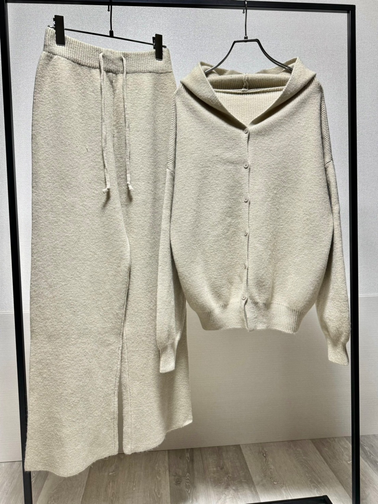 フード付きカーディガン×ワイドPT/knitセットアップ/ライトベージュ