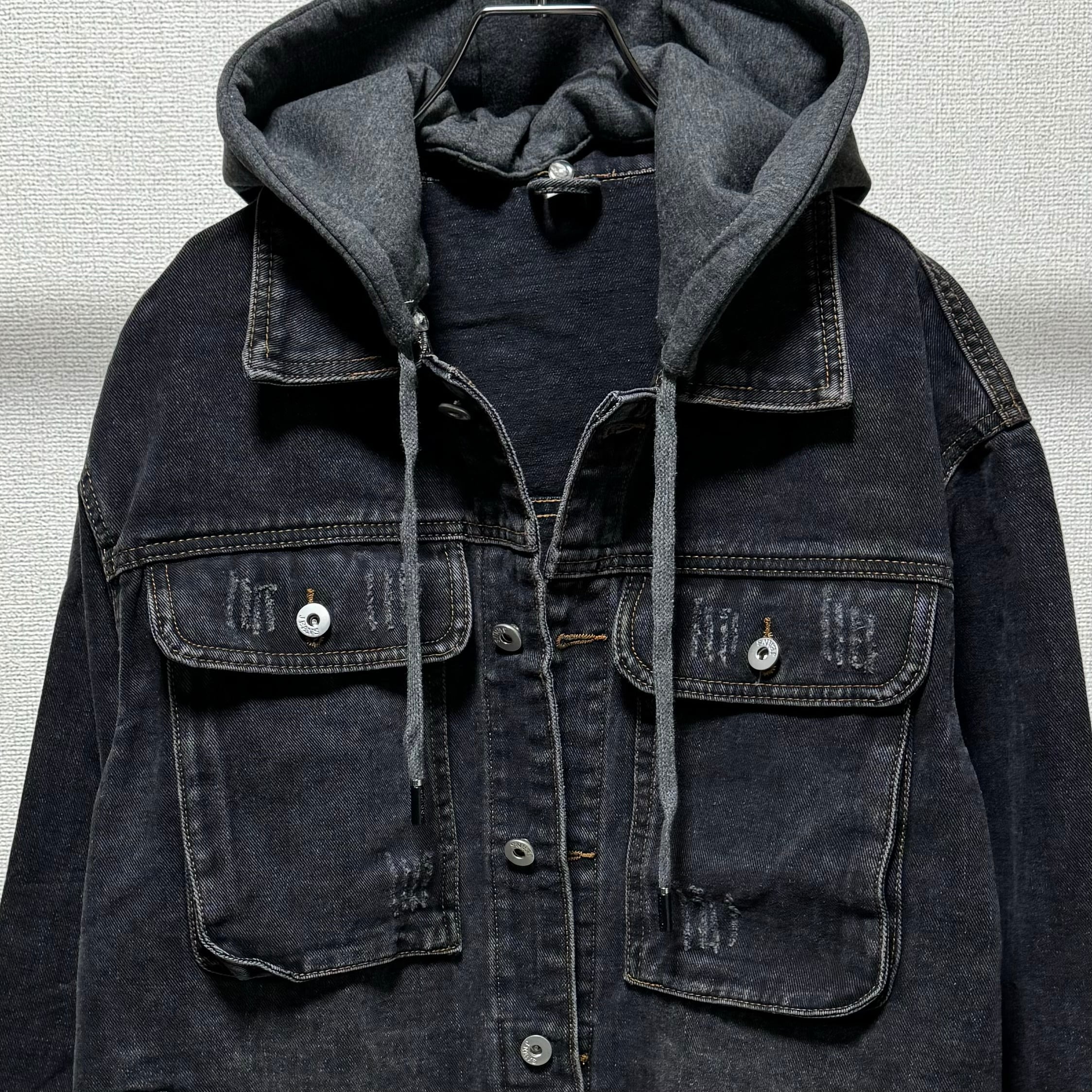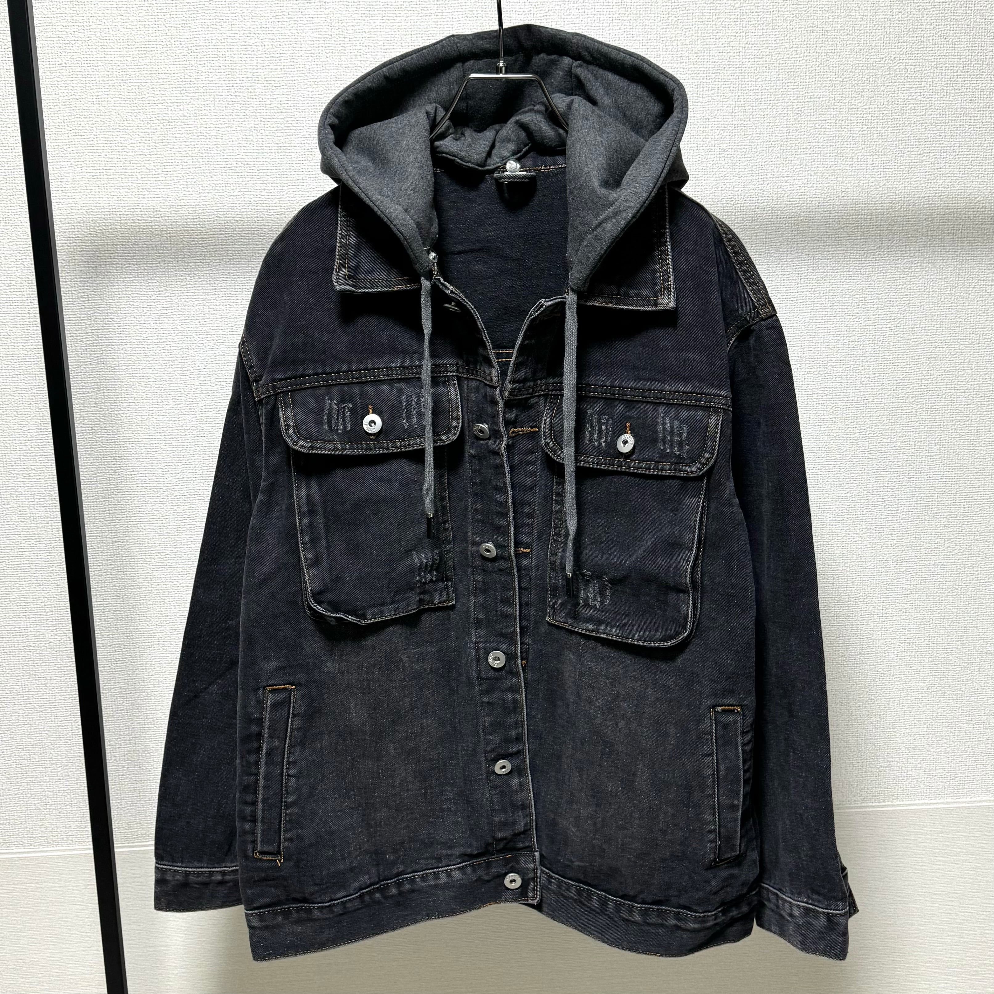 フード付きポケットdesignダメージウォッシュdenim オーバーJK/ブラック