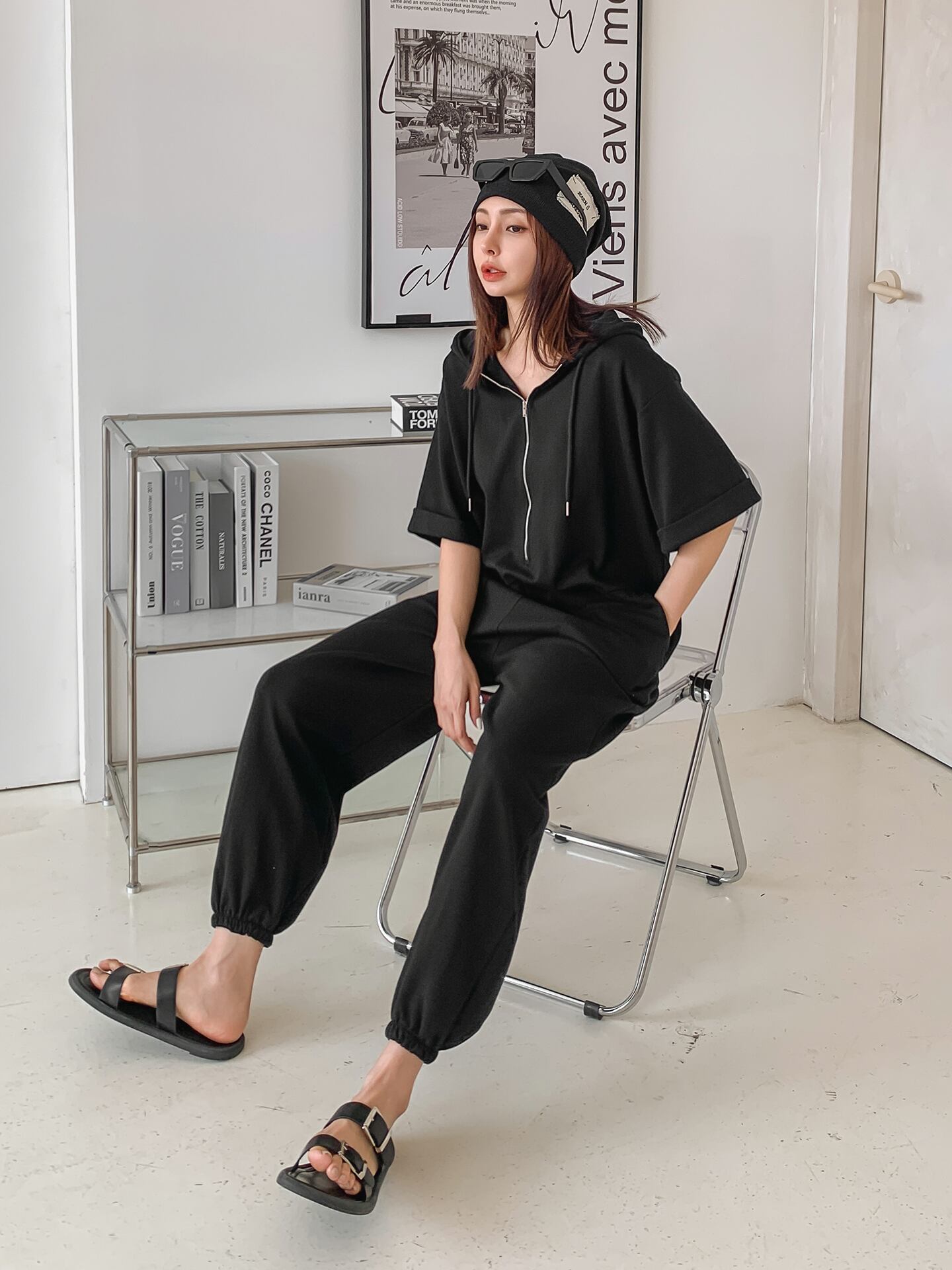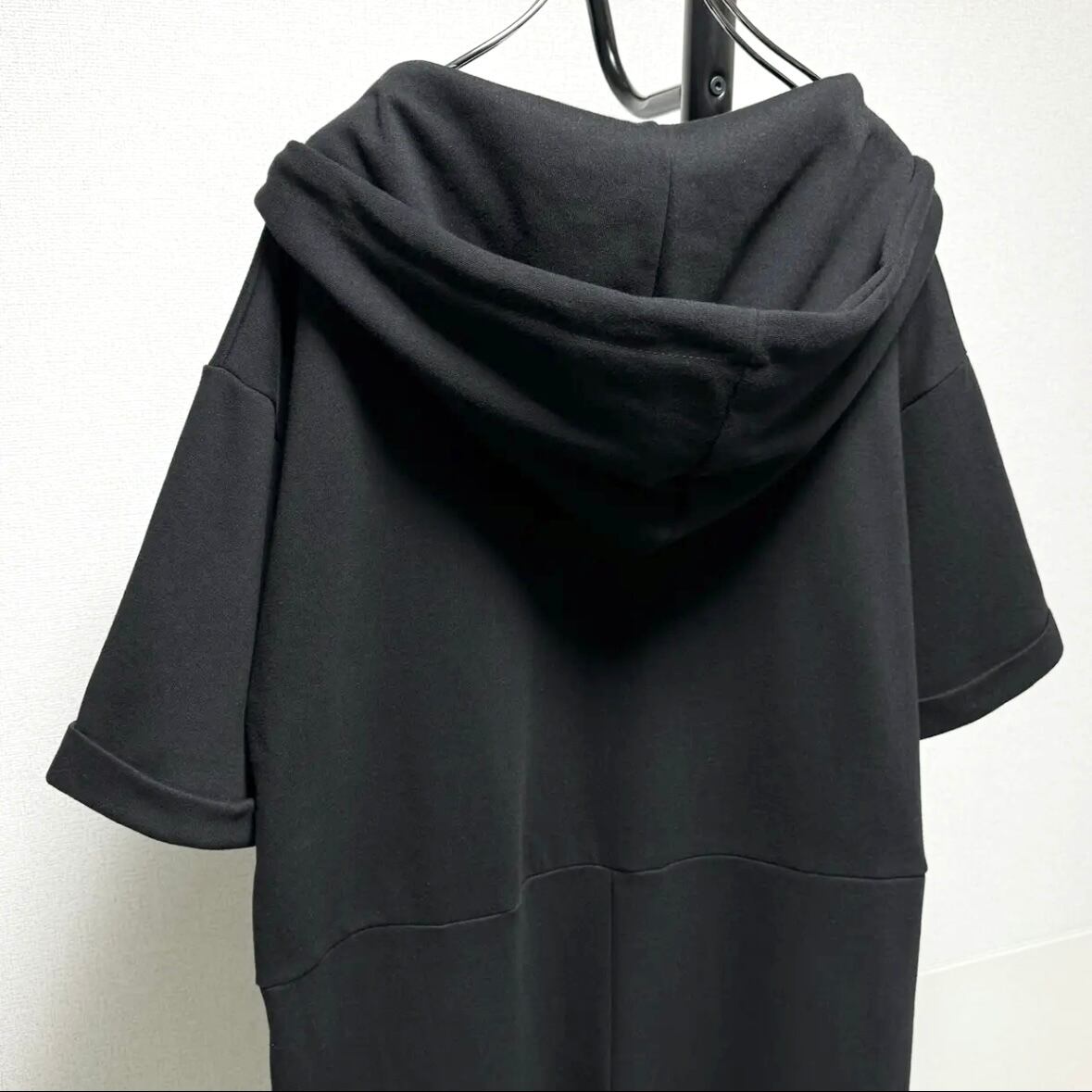 front half zip スウェットオールインワン/ブラック