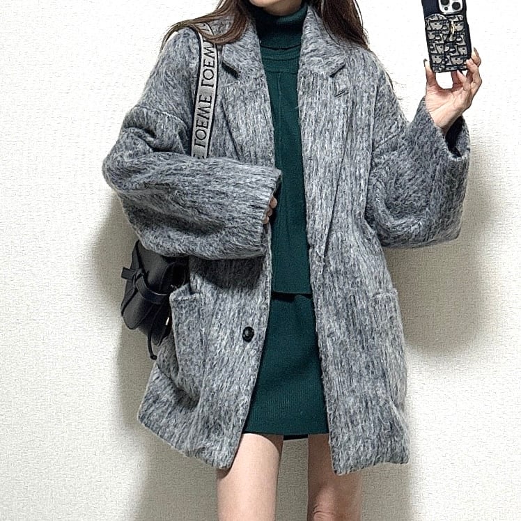 毛足のあるグレーMIXカラーがマニッシュな落ち着いた印象がありシャギー素材がトレンドライクな一枚です