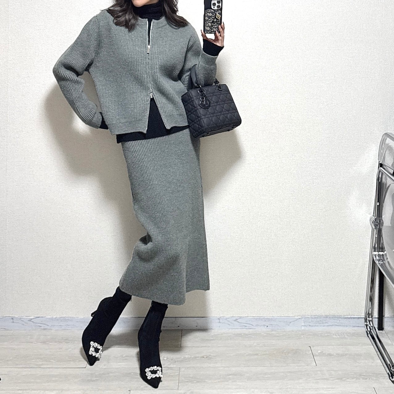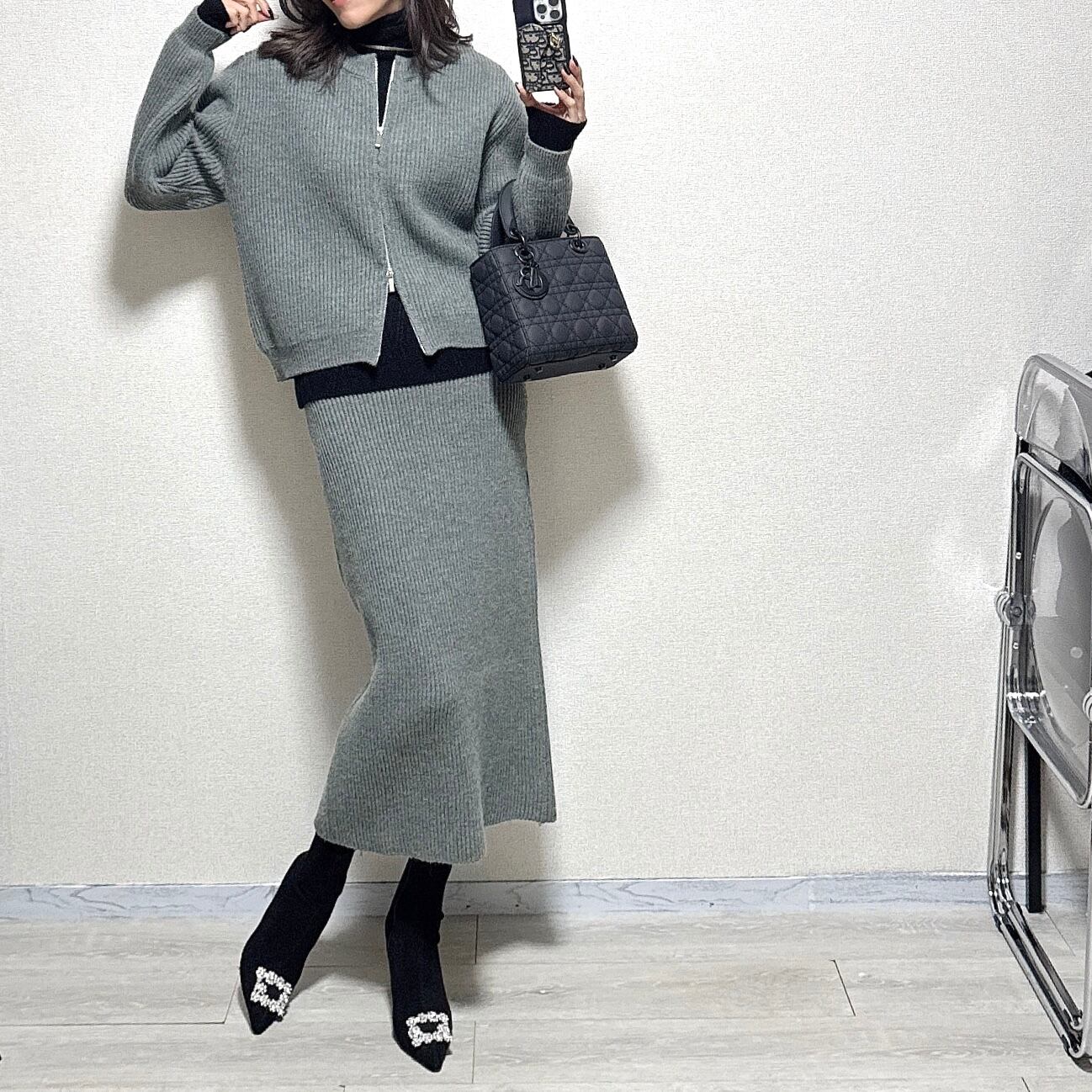 ダブルzipカーデtops×ストレートtide SK/肉厚リブknitセットアップ/グレー