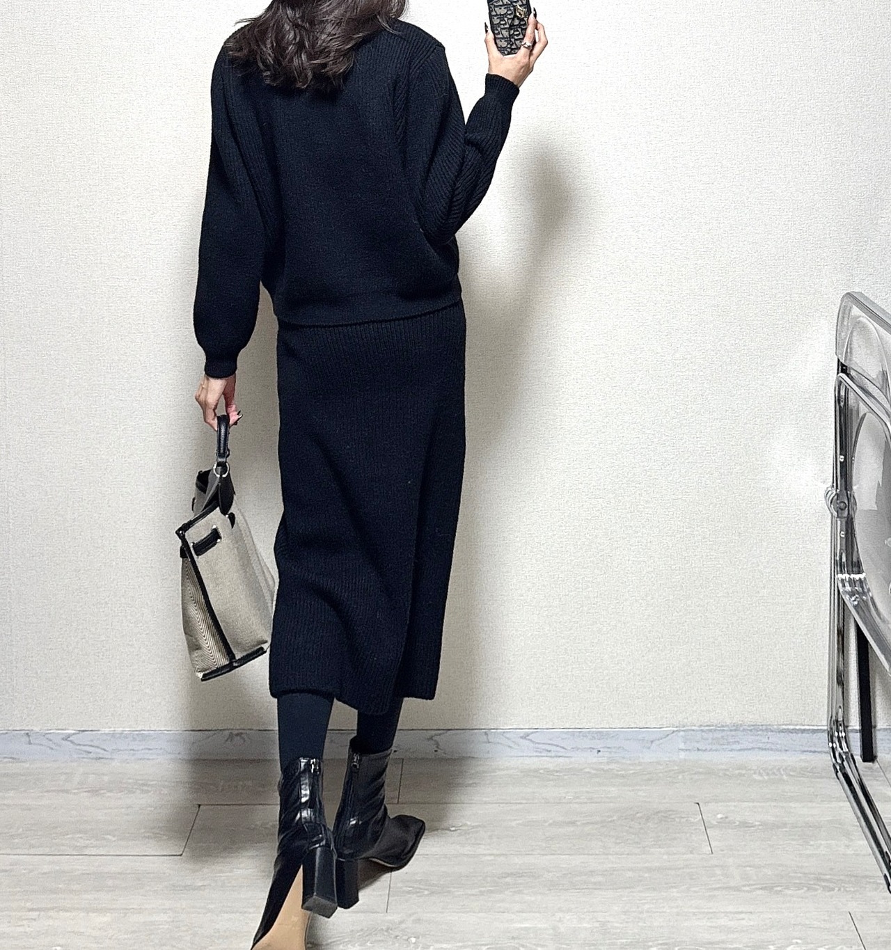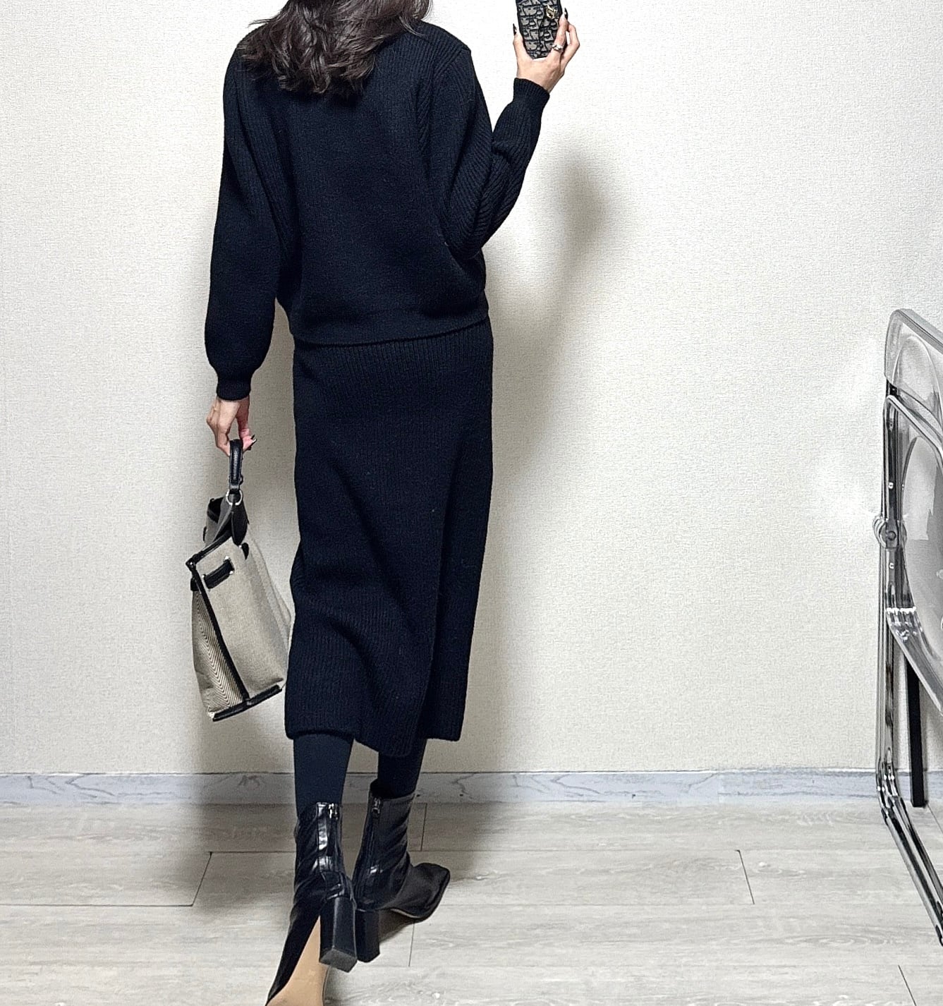 ダブルzipカーデtops×ストレートtide SK/肉厚リブknitセットアップ/ブラック