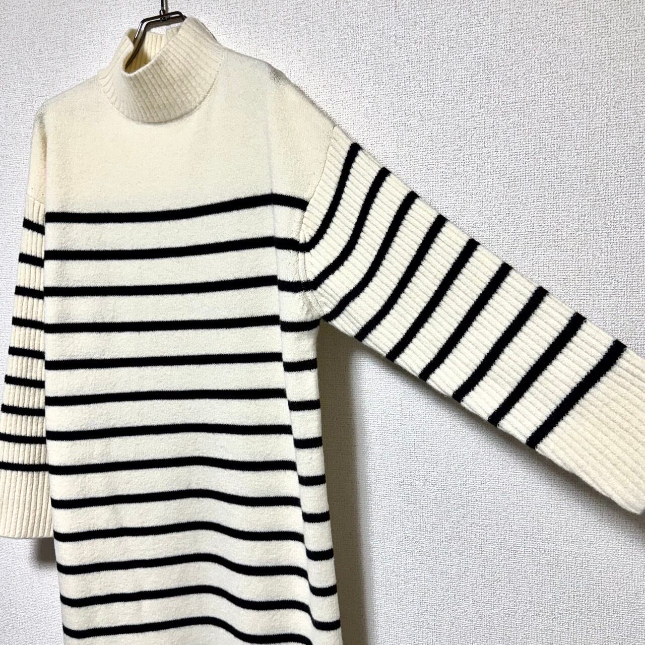 ハイネックボーダー袖リブ切替えknitワンピース/アイボリー