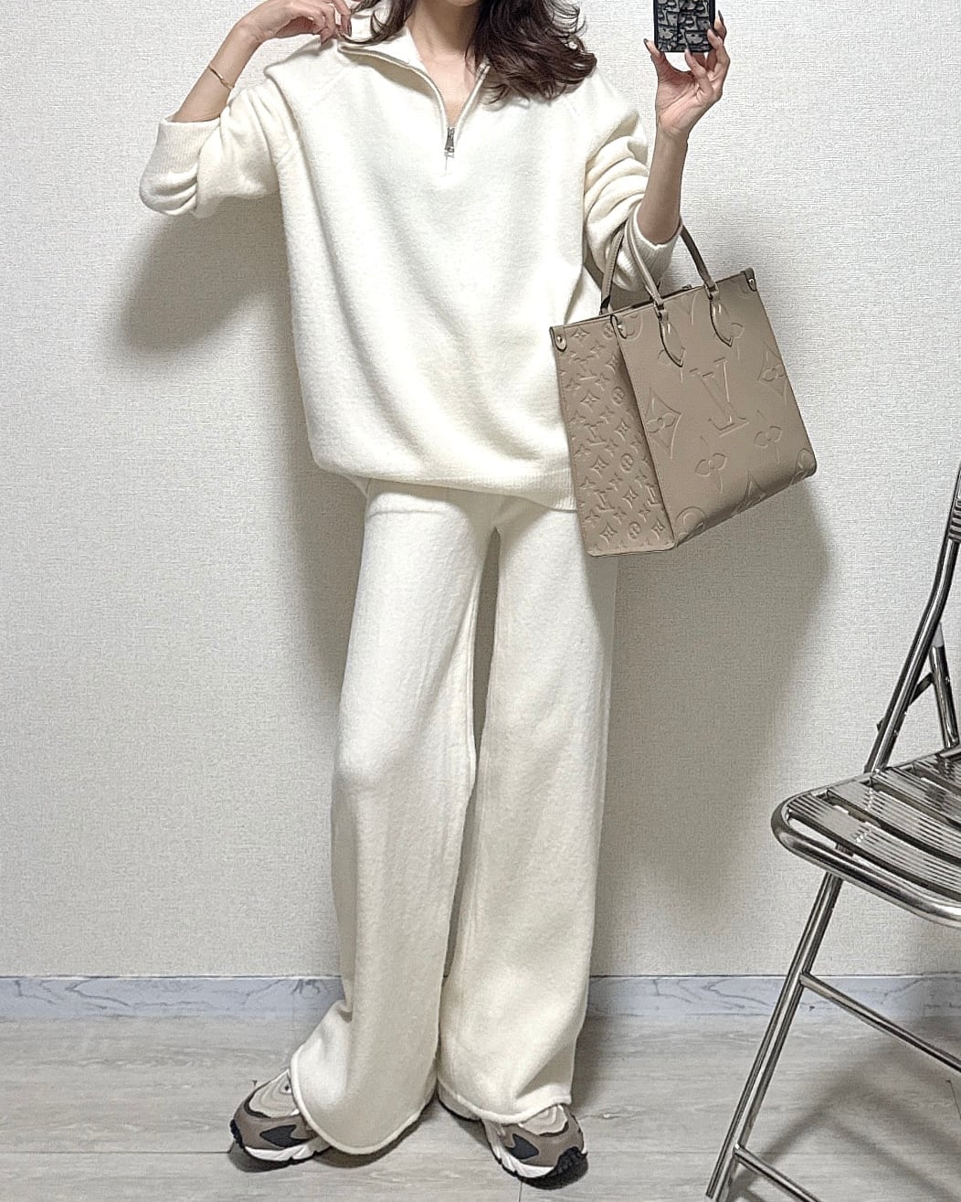 スタンドhalf zipニット×ワイドニットPT/セットアップ/アイボリー
