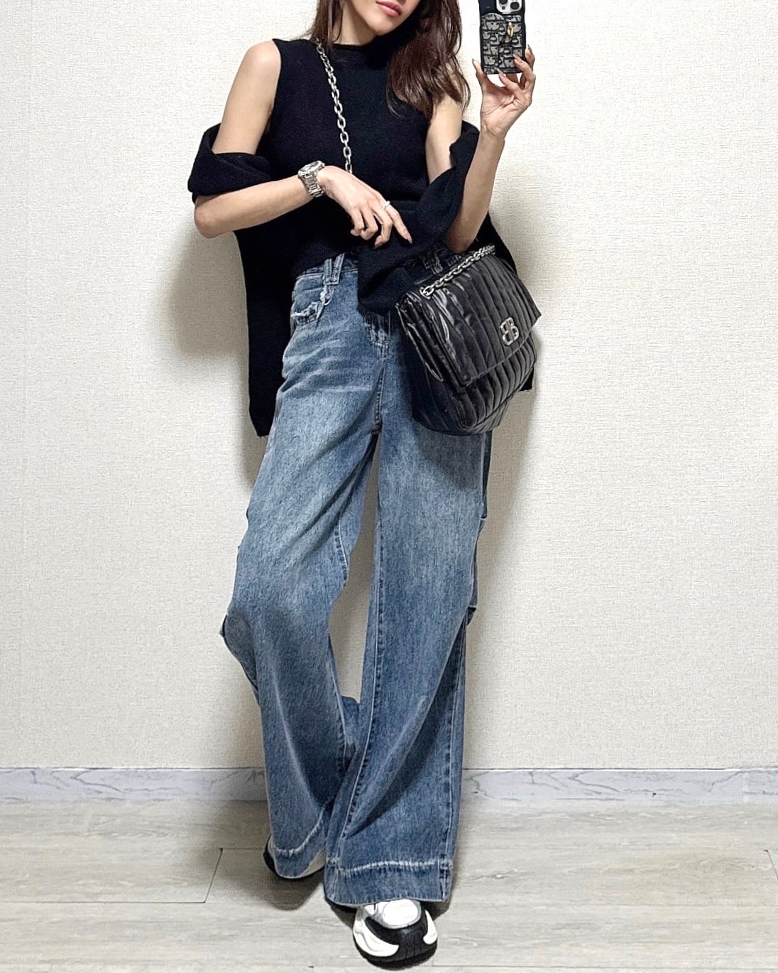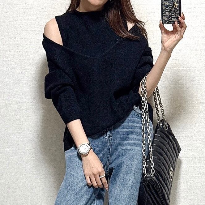 ボトルネックノースリニットとゆっるとしたVネックニットプルオーバーで今年らしいスタイリングにアップデートしてくれます